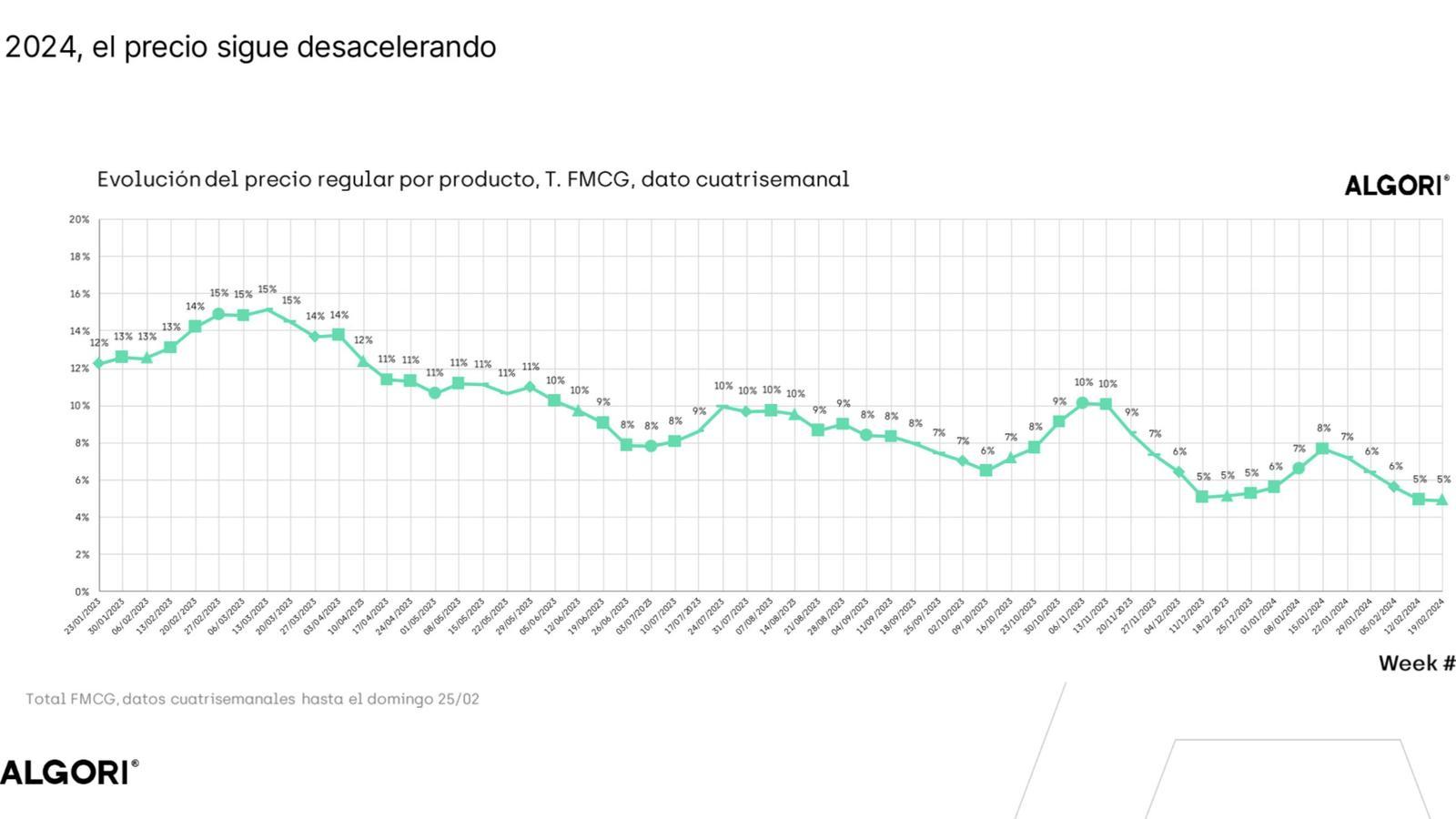 Sin embargo, no cabe perder de vista que, si bien la inflación comienza a desacelerarse, los precios siguen subiendo mes a mes. La guerra se circunscribe a una rebaja de precios en paquetes de ciertos productos (habitualmente, con el compromiso de no realizar subidas en todo 2024).