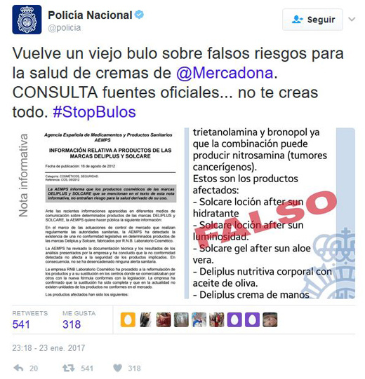 "Vuelve un viejo bulo sobre falsos riesgos para la salud de cremas de Mecadona. CONSULTA fuentes oficiales... no te creas todo. #StopBulos", afirma en sus redes sociales la Policía Nacional.