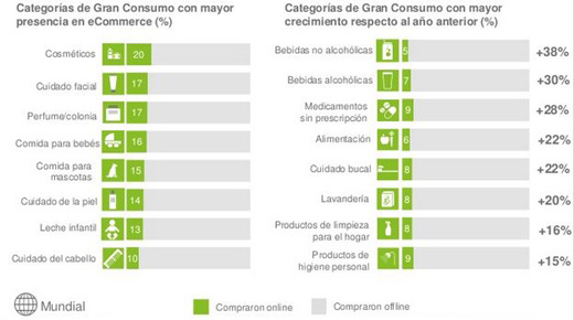 A nivel mundial, las categorías de gran consumo con mayor presencia en ecommerce son cosméticos (20%), cuidado facial (17%) y perfume o colonia (17%). Sin embargo, en el último año las que mayor crecimiento han experimentado en el comercio online han sido las bebidas no alcohólicas, las alcohólicas y los medicamentos.