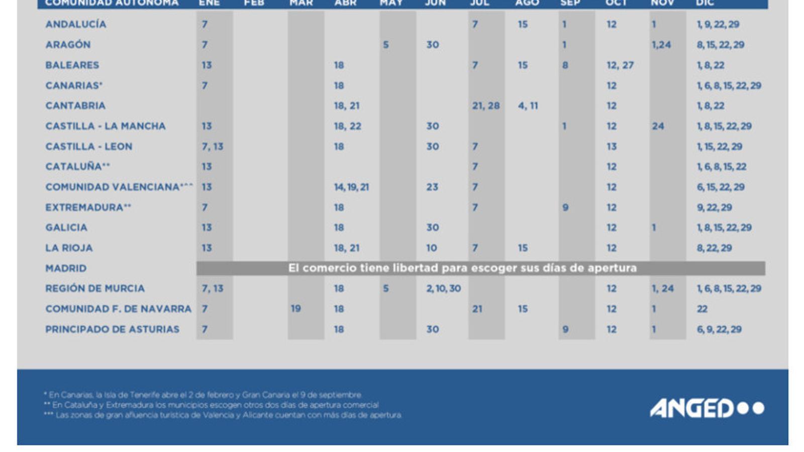 Comienza un nuevo año y los consumidores se enfrentan, de nuevo, a la incertidumbre sobre los domingos y festivos que abrirán los comercios en sus respectivas localidades. Por ello, la Asociación Nacional de Grandes Empresas de Distribución (Anged) ha publicado el calendario comercial 2019 de cada comunidad autónoma recordando, eso sí, que el comercio físico "desconecta por completo 56 días al año".