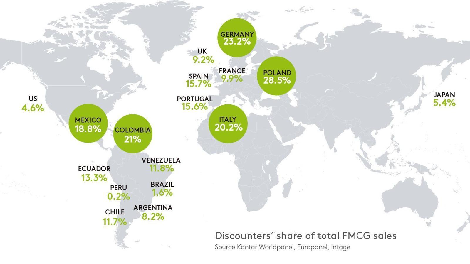 Ya mirando al resto del planeta, es el Latinoamérica donde los discounters gozan de buena salud. Sobre todo en Colombia (21%) y en México (18,8%). En Brasil (1,6%) o Perú (0,2%) apenas tienen desarrollo. En el mercado brasileño los precios en hipermercados son similares a los discounters, por lo que la evolución está siendo más apostar por formatos como el cash & carry que por el discount.