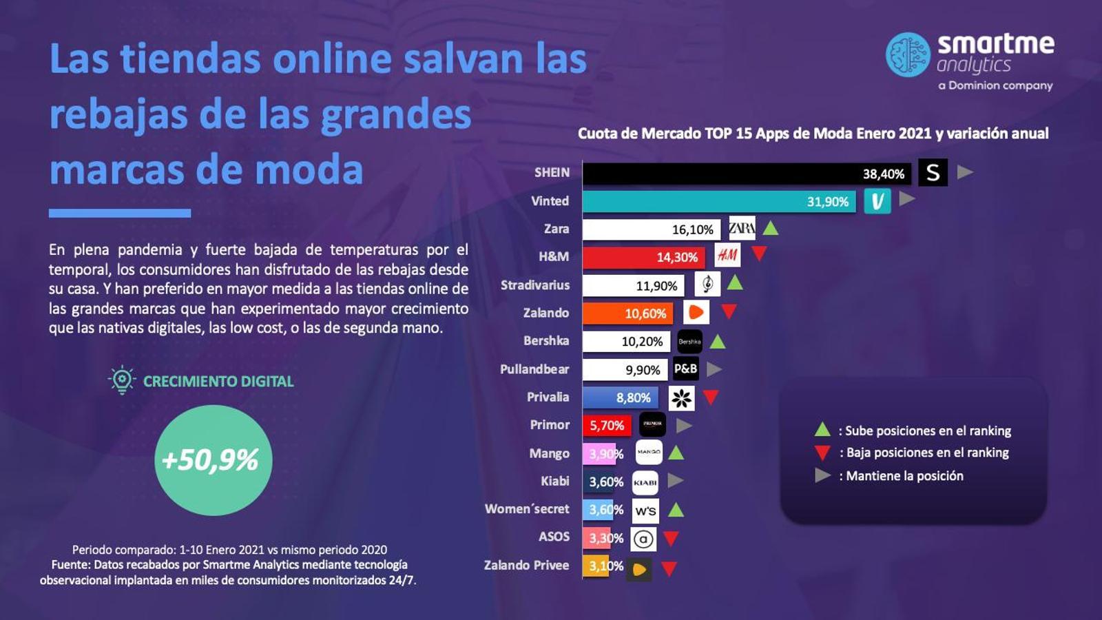 "Tras meses de liderazgo de las apps de moda de las marcas lowcost y de segunda mano, las rebajas han amenazado su estabilidad. Posiblemente estén influyendo varias circunstancias: la disminución del tráfico a las tiendas físicas por el temporal, la crisis sanitaria, y la mayor disponibilidad de gasto para 'invertir' en marcas de precios más altos ya que muchos españoles han reducido su gasto en restaurantes y viajes. El único canal que está creciendo en el sector moda es el canal digital y según los datos disponibles el crecimiento de 1-10 de enero de 2021 con respecto al mismo periodo en 2020 ha sido del 51%", explica Lola Chicón, CEO de Smartme Analytics.
