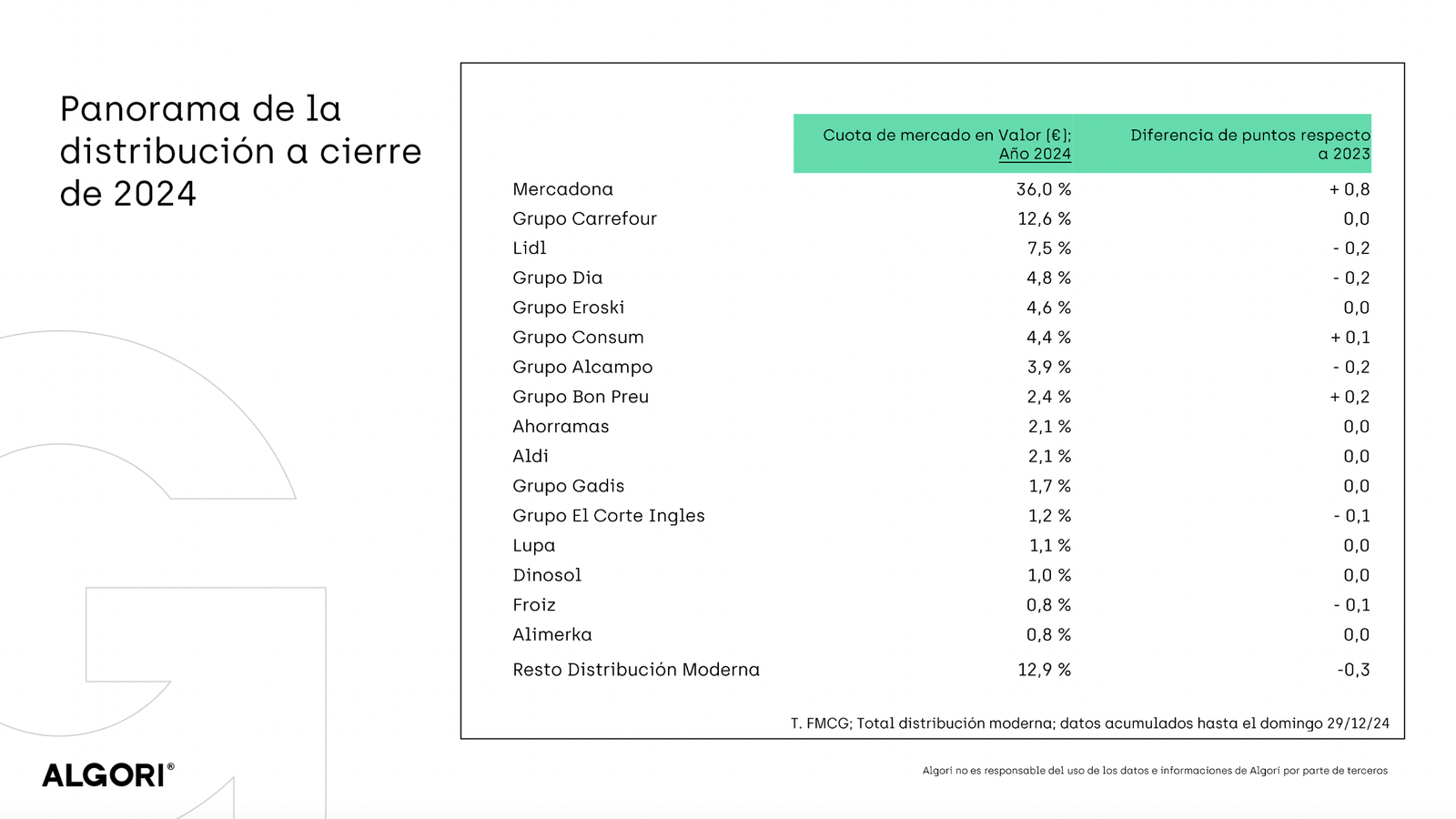 Mercadona es la gran enseña ganadora en el conjunto del 2024, con un avance de cuota de ocho décimas hasta el 36% de la distribución moderna en España, según Algori.