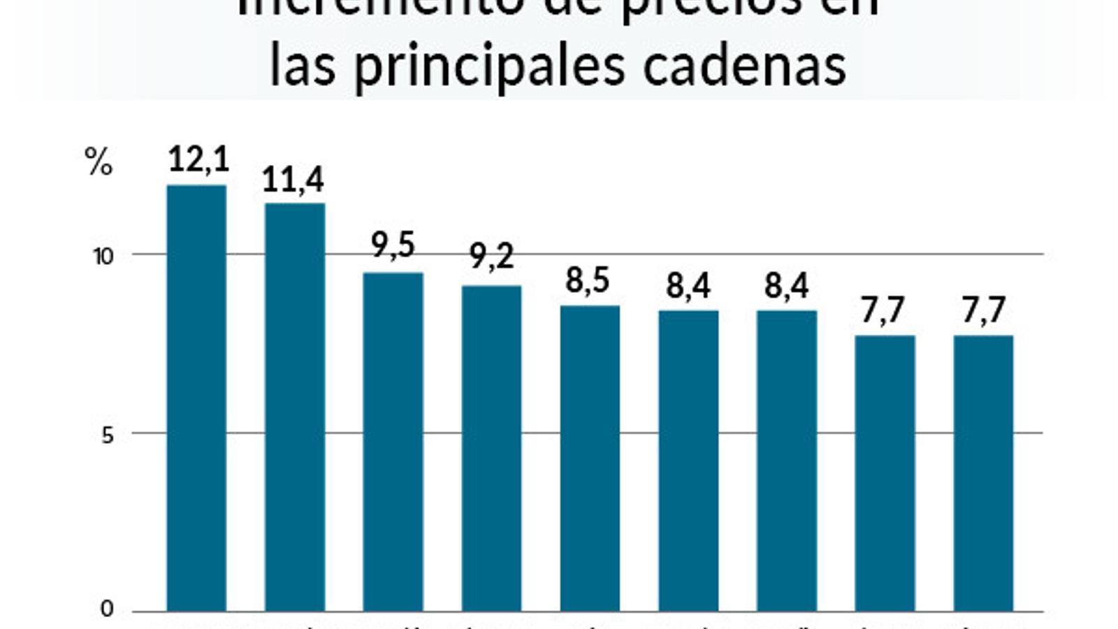 Carrefour y Mercadona acumulan una subida media de precios en productos de alimentación, higiene y droguería del 12,1% y del 11,4% respectivamente desde marzo de 2021, aunque siguen manteniéndose entre las cadenas nacionales más baratas, junto con Alcampo. En El Corte Inglés e Hipercor la subida de precios ha sido del 7,7%.