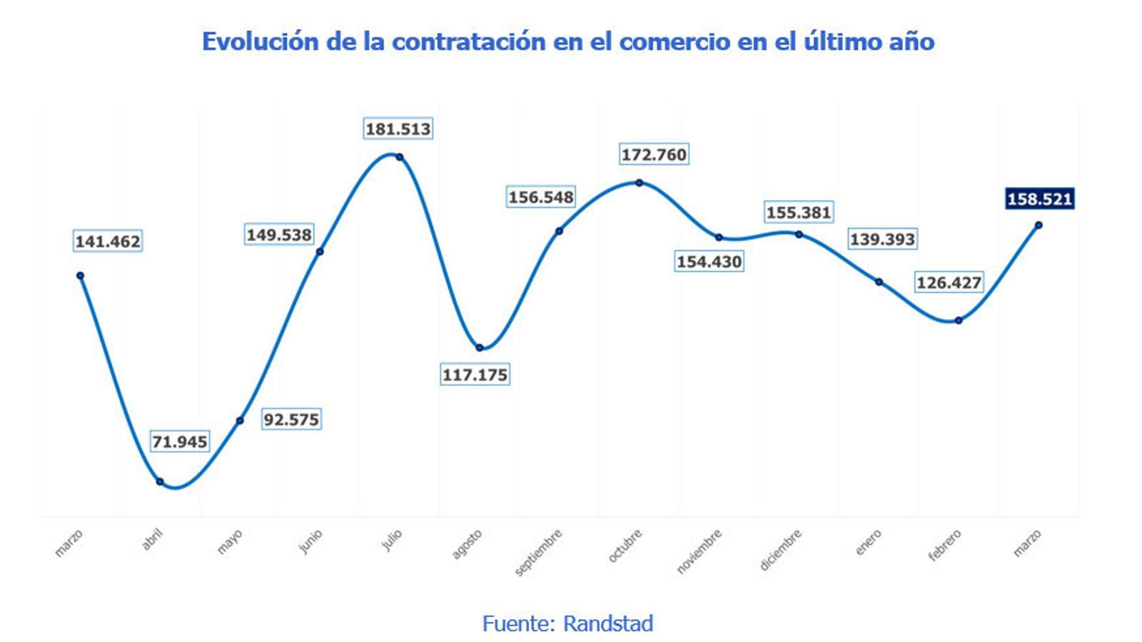 En cuanto a datos de empleo, Randstad destaca que, en el último año, el número de contratos firmados en comercio ha aumentado el 12,1%. De hecho, en el mes de marzo se firmaron 158.521 contratos en el sector, el tercer mayor volumen de los últimos doce meses, solo tras julio (181.513) y octubre (172.760). Además, la cifra de este pasado marzo rompe con una tendencia negativa de cuatro meses consecutivos de descensos.