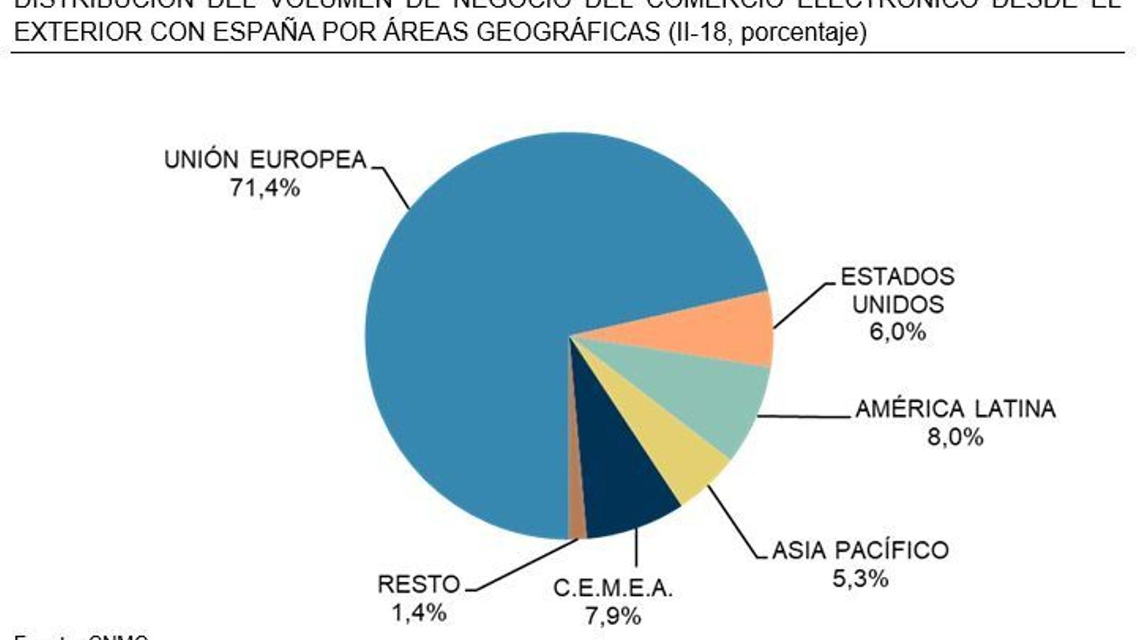 Asimismo, según este análisis, el volumen de negocio de las transacciones con origen en España y dirigidas hacia el exterior ha sido de 4.442 millones de euros, un 36,9% más que en el segundo trimestre del año anterior. El 93,2% de las compras desde España hacia el exterior se dirigen a la Unión Europea.