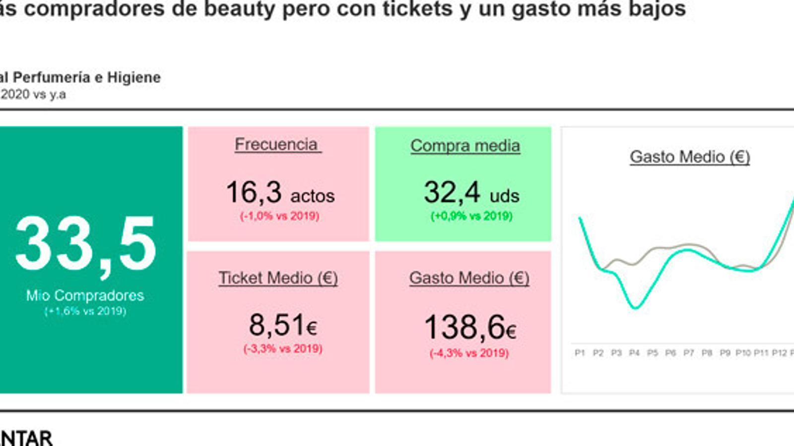 Los datos de la consultora demuestran un aumento en el número de compradores en artículos de belleza, hasta llegar a los 33,5 millones, el 1,6% más con respecto al año anterior. Aun así, se ha reducido la frecuencia de compra el 1%, alcanzando los 16,3 actos y un gasto medio de 138,6 euros. En las cestas básicas, los productos de higiene han aumentado el 6,3%, a diferencia de los productos de belleza que han disminuido el 10%.