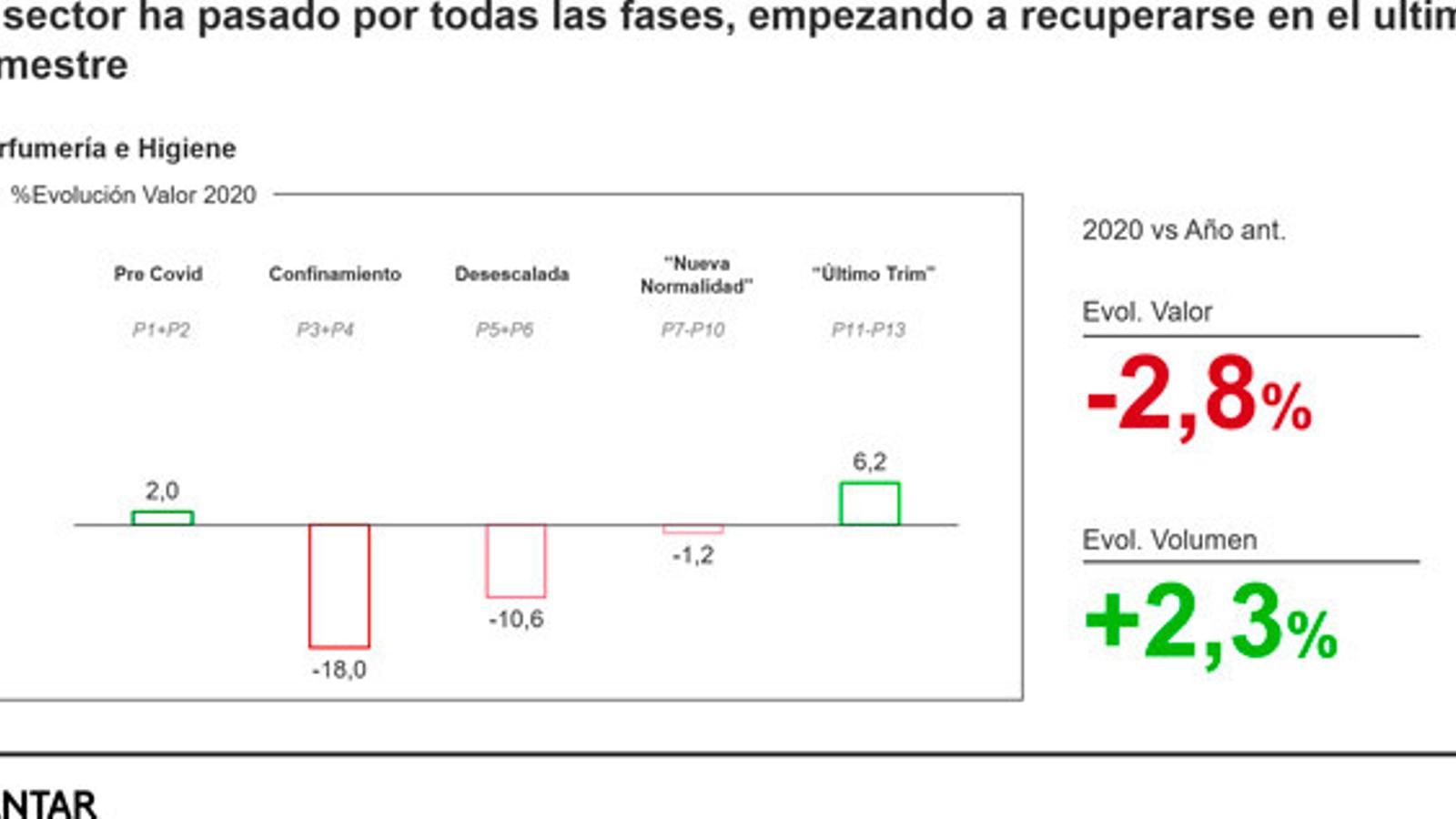 Así como en la etapa previa a la pandemia el porcentaje de evolución del valor en perfumería e higiene era el 2% superior con respecto al año anterior, esta cifra se redujo al -18% durante el confinamiento, a partir del cual empezó a recuperarse hasta llegar al 6,2% en el último trimestre del año.