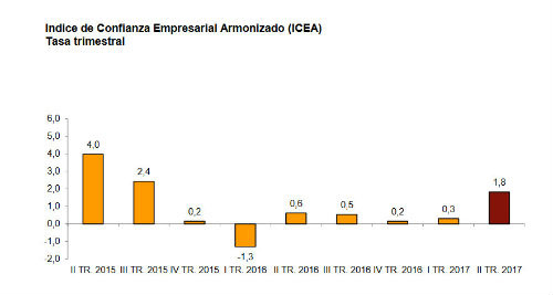 El Indicador de Confianza Empresarial Armonizado (ICEA) subió el 1,8% en el segundo trimestre de 2017 respecto al trimestre anterior. Se trata de la mayor alza desde el tercer trimestre de 2015, según publica el Instituto Nacional de Estadística (INE). Con este repunte este indicador encadena cinco trimestres de tasas positivas.