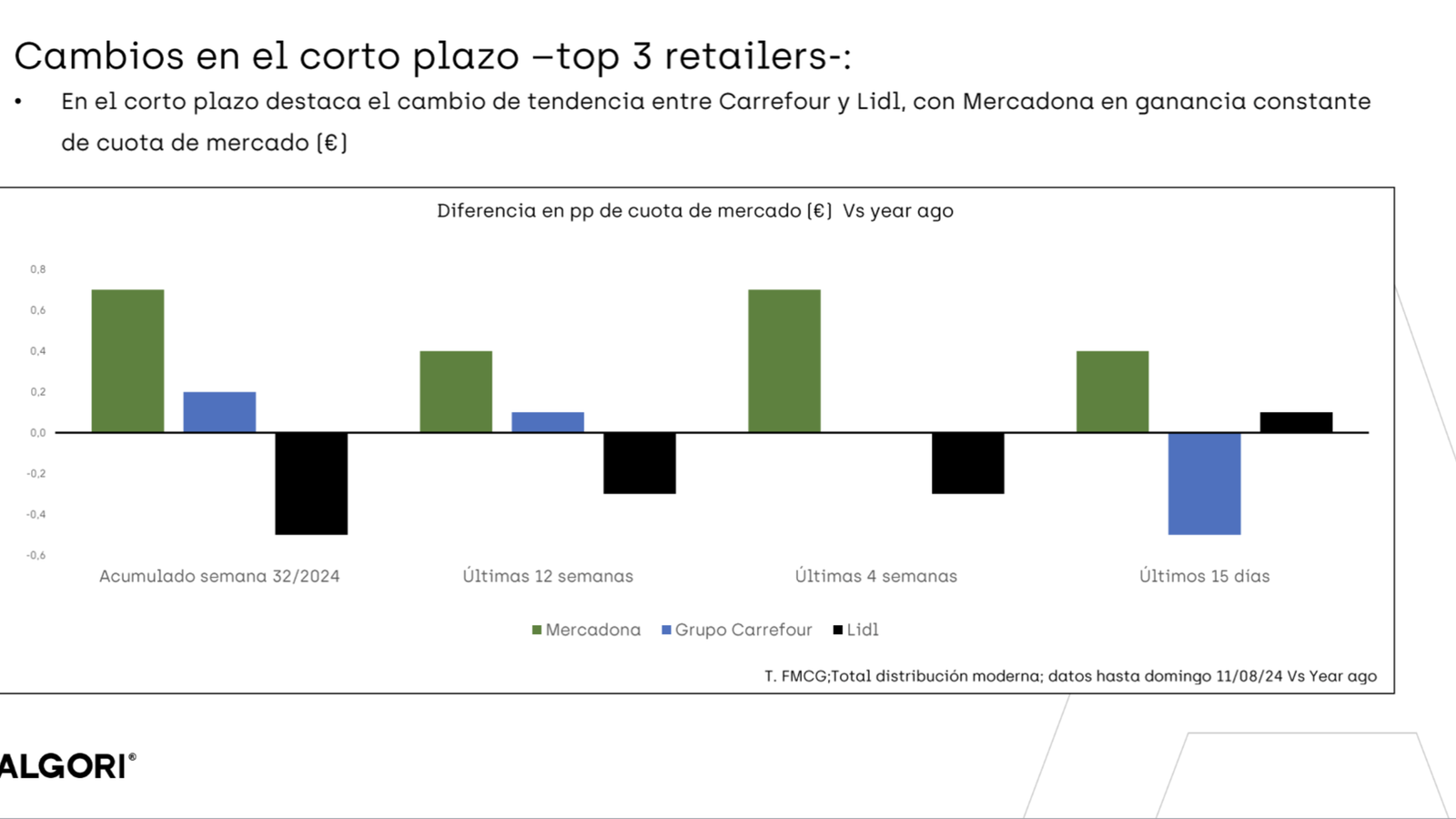 En las primeras 32 semanas de 2024, Lidl perdió cinco décimas de cuota de mercado frente al avance del 0,2% de Carrefour. En las últimas 12 semanas, que concluyen el pasado 11 de agosto, Lidl retrocedió tres décimas y Carrefour avanzó una décima; en las últimas cuatro, el discounter retrocedió de nuevo tres décimas y la enseña que dirige Elodie Perthuisot permaneció estable, mientras que en los últimos 15 días Lidl ha logrado volver a crecer en cuota de mercado (+0,1%) frente a un retroceso de cinco décimas de Carrefour.