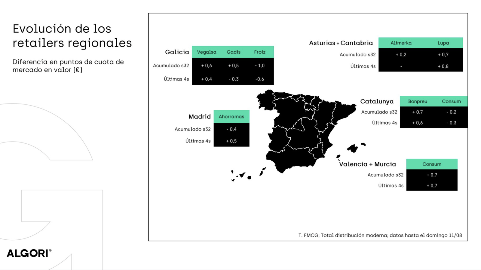 Consum ha crecido siete décimas en la Comunidad Valenciana y Murcia en las últimas cuatro semanas que concluyen el domingo 11 de agosto. BonPreu, seis décimas en Cataluña; Lupa, ocho décimas en Asturias y Cantabria. Incluso Ahorramas logra crecer cinco décimas en el mismo periodo en la Comundidad de Madrid, lo que le ha permitido revertir una débil primera mitad de año (-0,4% en las primeras 32 semanas de 2024).