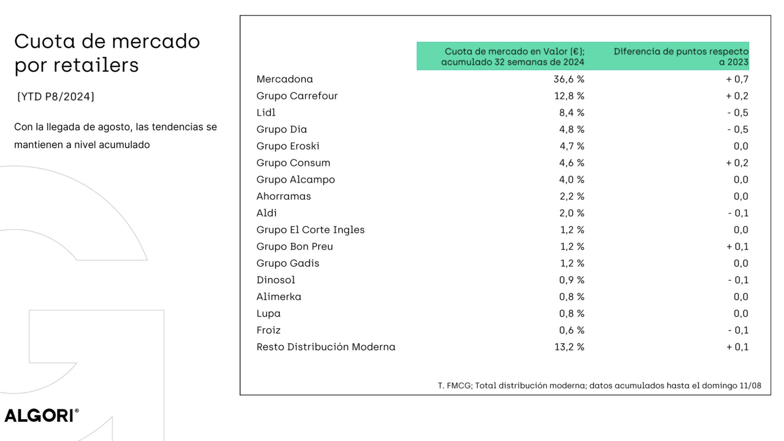 Por su parte, Mercadona crece de manera sostenida a lo largo de todo este periodo y ya se sitúa en el 36,6% de cuota de mercado en la distribución moderna, con un avance del 0,7% respecto a 2023. Carrefour ocupa la segunda posición con el 12,8% (+0,2%) y Lidl completa el podio con el 8,4% (-0,5%), seguidos de Grupo Dia (4,8%), Eroski (4,7%), Consum (4,6%), Alcampo (4,0%), Ahorramas (2,2%), Aldi (2,0%), El Corte Inglés (1,2%) y BonPreu (1,2%), entre otros.
