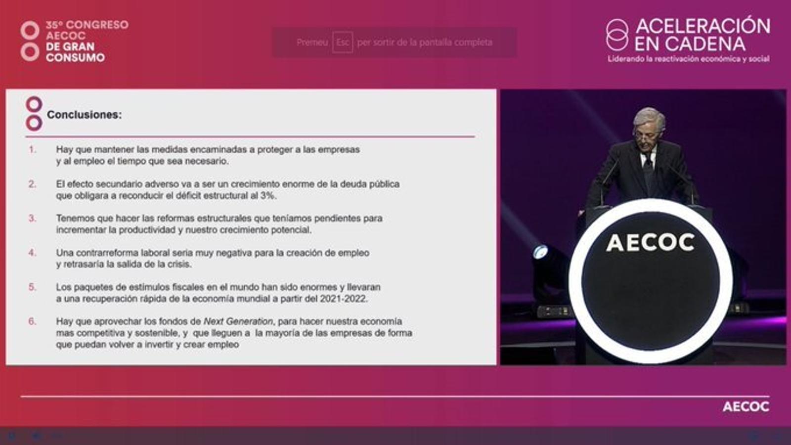 El 35º Congreso de Gran Consumo de Aecoc, que se celebra este miércoles en el Palacio de Congresos de Valencia en formato exprés y entre importantes medidas de seguridad e higiene ante la pandemia del coronavirus, ha puesto de manifiesto, sin paliativos, la crítica situación que atraviesa el sector en España y la necesidad urgente de tomar medidas que suavicen el "desastroso" panorama que se avecina para la empresa española. Las previsiones del sector apuntan a una caída del 16% este año y que en 2022, se encontrará en niveles todavía el 4% inferiores a 2019. La recuperación, por tanto, tiene que esperar. Con todas las consecuencias que ello implica.