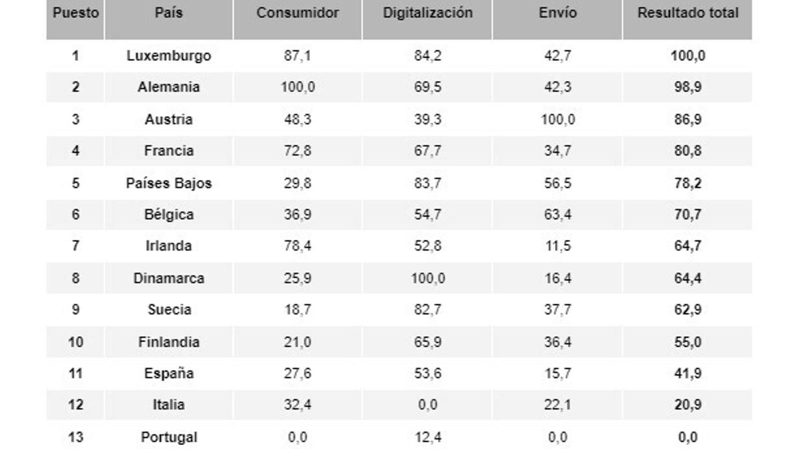 Italia y Portugal se encuentran al otro lado de la lista con una puntuación más baja. Las razones son sus infraestructuras de envío menos resistentes y sus consumidores cautelosos en el comercio electrónico transfronterizo.