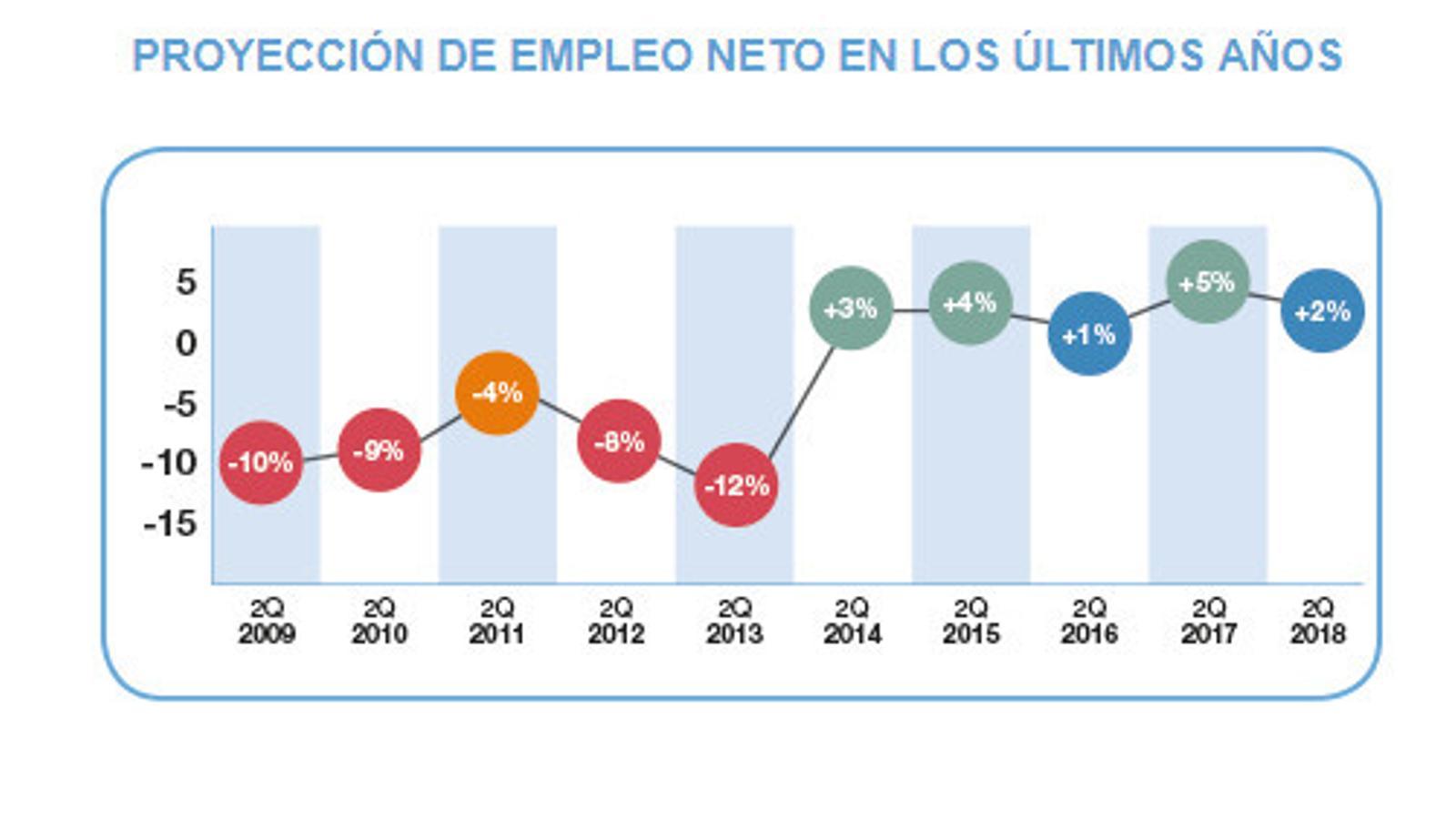 Los directivos españoles moderan su optimismo en la contratación para el segundo trimestre de 2018 y sitúan la Proyección de Empleo Neto en un +2%. Las previsiones se reducen así tres puntos porcentuales en comparación con el periodo anterior y el mismo trimestre de 2017. "No obstante, España mantiene el signo positivo, en línea con el buen comportamiento de nuestra economía y el entorno internacional favorable".