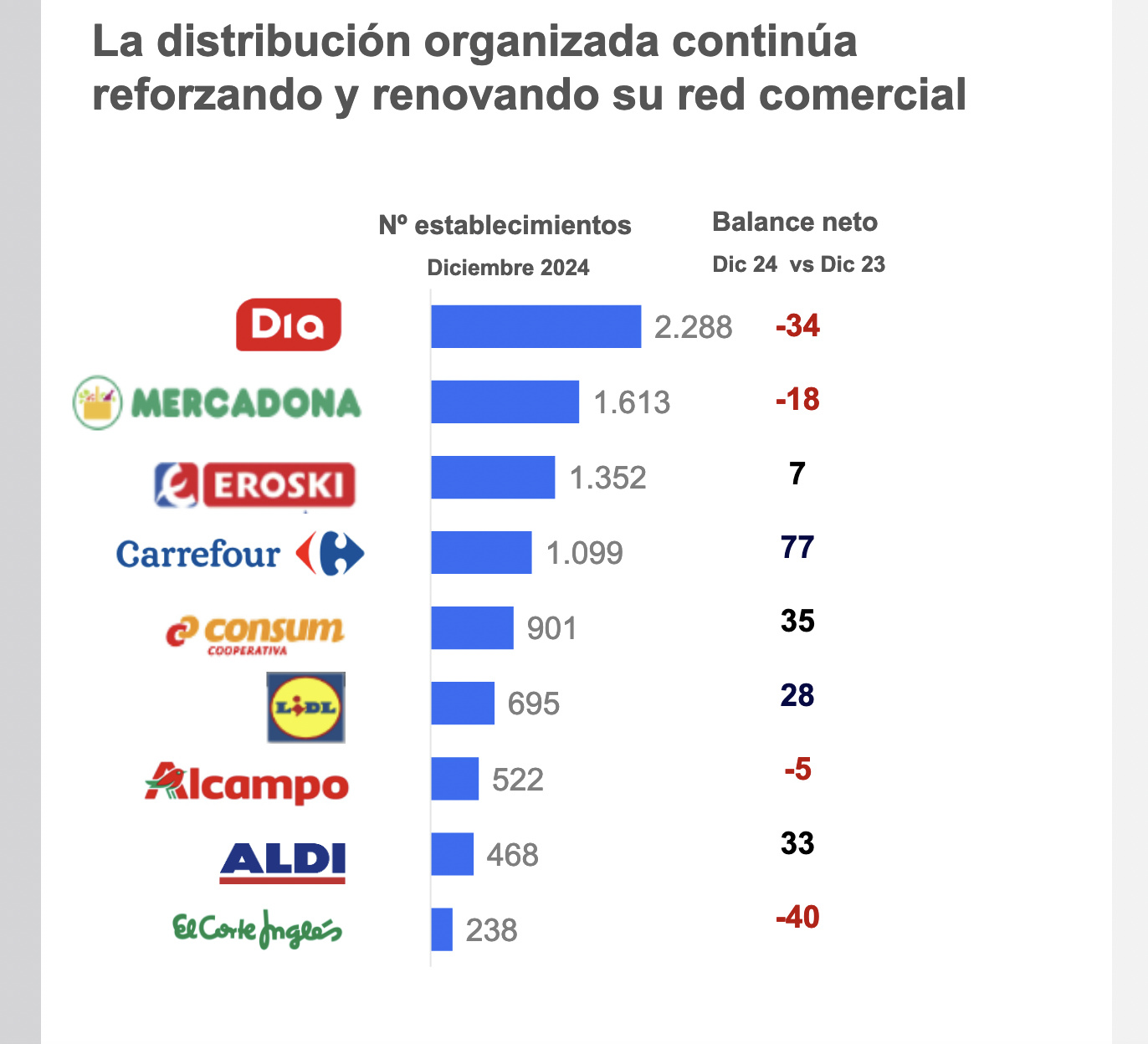El Corte Inglés cerró 40 tiendas, en buena medida producto de las ventas a Carrefour y de su desinversión en grandes almacenes; seguida de Grupo Dia, que cerró 34 tiendas; Mercadona, que cerró 18; y Alcampo, que cerró cinco.