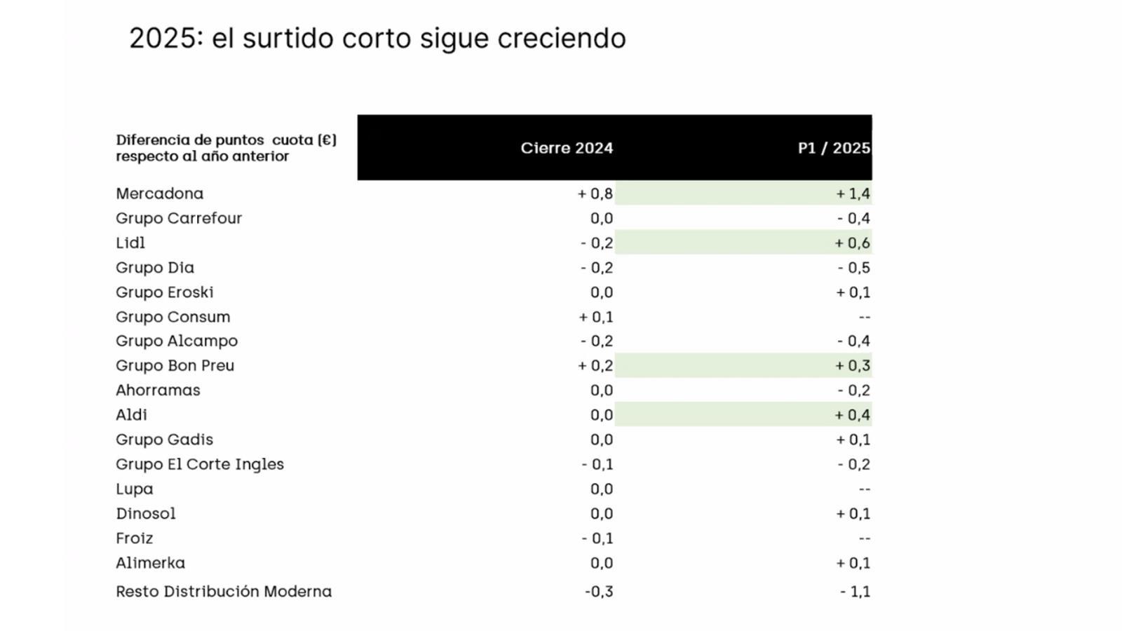 Mercadona culmina este periodo con un 1,4% más de cuota respecto al año pasado, seguida de Lidl (+0,6%) y Aldi (+0,4%).