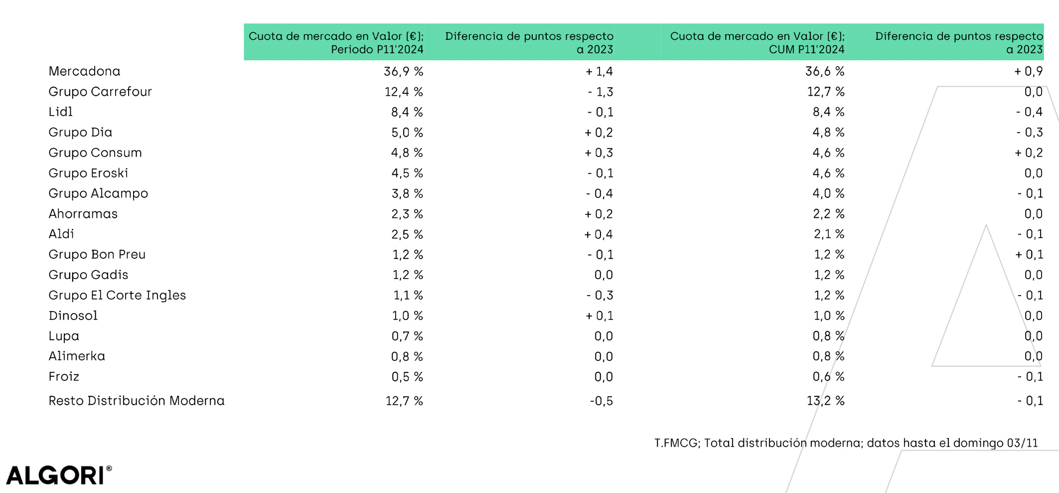 Mercadona ha avanzado el 1,4% interanual hasta el 36,9% de cuota de mercado en la distribución moderna en el mes de octubre (más específicamente, las cuatro semanas que concluyen el 3 de noviembre), según datos de Algori