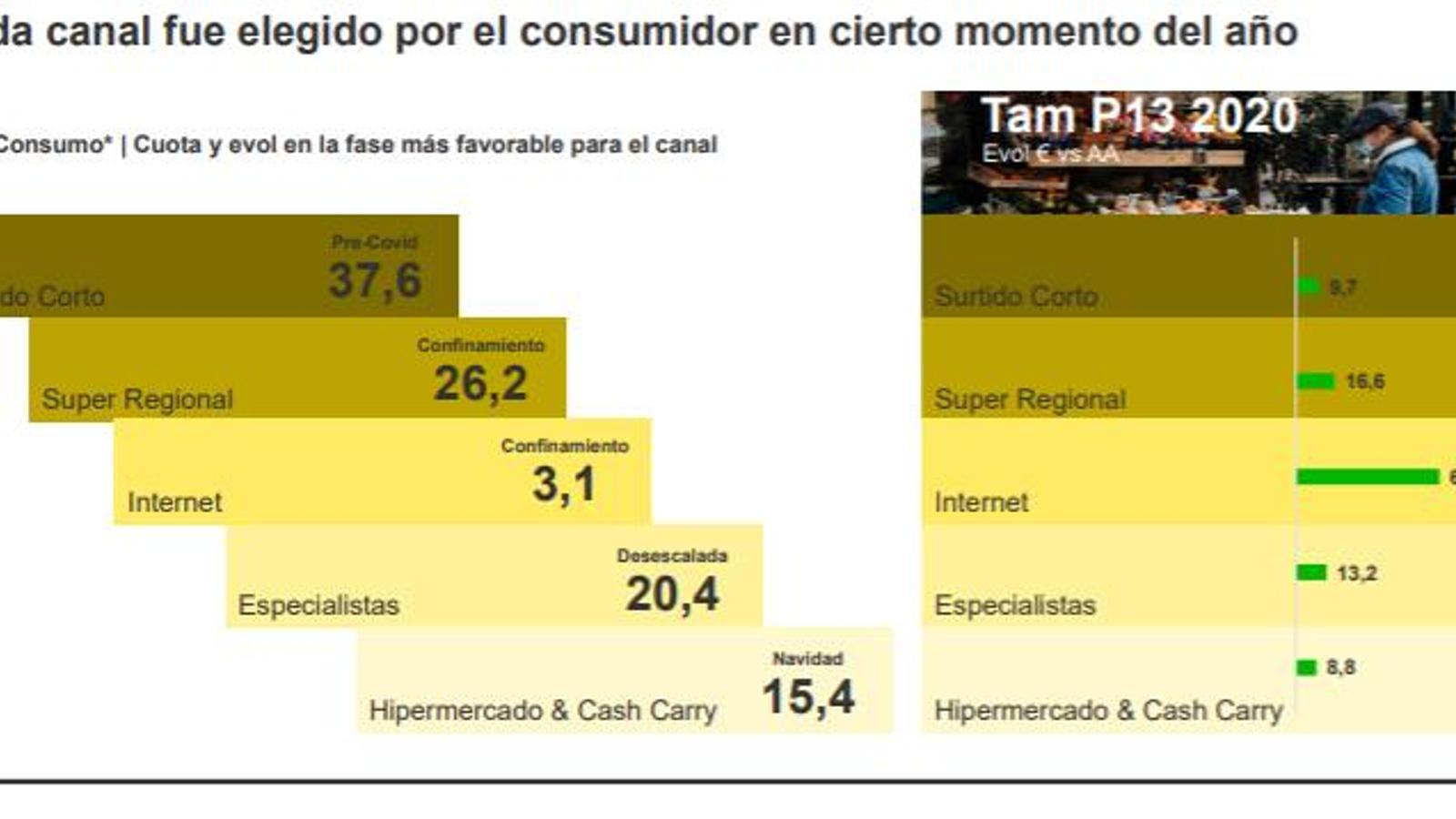 El hogar español ha aprovechado este amplio rango de opciones para adecuar, en diferentes momentos del año, su lugar de compra según la situación sanitaria. El año comenzó con un canal de 'surtido corto' que reforzaba el crecimiento de los últimos ejercicios, alcanzando un 37,6% de cuota en la época precovid. Con el confinamiento, el comprador se decantó por la proximidad –los supermercados regionales alcanzaron el 26,2%– y la practicidad –el ecommerce logró el 3,1%–. En la desescalada vivimos una de las grandes novedades del año, con la recuperación de los mercados y las tiendas de toda la vida, y, con ello, el canal especialista creció dos puntos hasta alcanzar el 20,1% de cuota de mercado. Finalmente, durante la navidad, son las grandes superficies de carga, el hipermercado y el cash and carry los que obtuvieron sus mejores números, llegando al 15,4%.