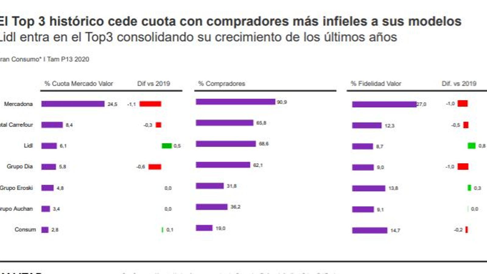 Según el balance de la distribución española presentado por Kantar este martes, el top 3 histórico, Mercadona, Carrefour y Dia, ha cedido cuota durante 2020 con compradores "más infieles" a sus modelos, al tiempo que Lidl le ha arrebatado el puesto a Dia consolidando su crecimiento de los últimos años.