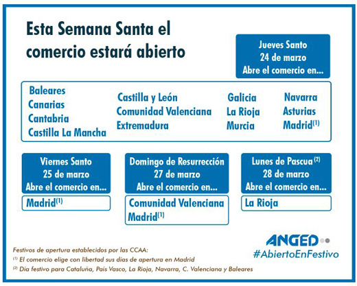 Ya en plena Semana Santa, el comercio tiene su plan de aperturas. Y es que en estos días uno de cada cinco españoles aprovecha los desplazamientos y sus vacaciones para realizar compras, según informa Anged.
