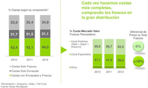 Así, la cuota de mercado de frescos en el canal dinámico (hiper + super + discount) fue del 52,4% en 2012 (50% en 2010; 50,7% en 2011). En cambio, en el canal especialista ha pasado al 39,4% (41,1% en 2010; 41% en 2011).