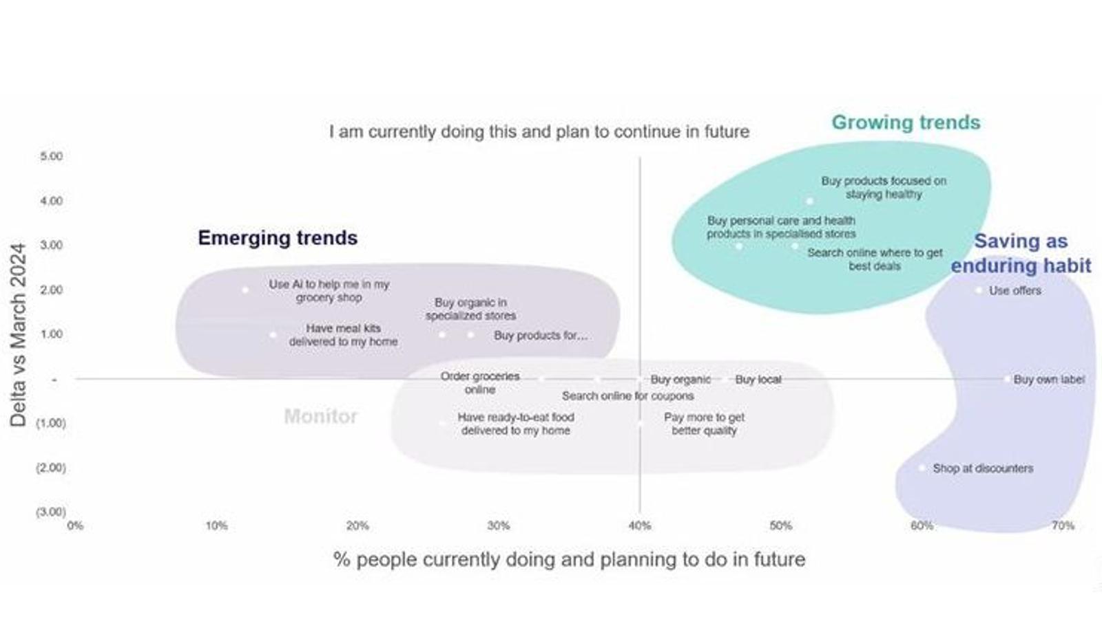 Ello no significa que el precio haya dejado de ser una variable importante para el consumidor, pero sí que este ha basculado hacia otros formatos de tienda a la hora de buscar ahorro: "Así, mientras que los hipermercados o discounters, conocidos por su relación calidad-precio, tienen menos clientes y ofrecen unos gráficos más planos, vemos que al mismo tiempo tiendas especializadas (de productos como salud y belleza, artículos ecológicos, congelados, etc.), que también permiten ahorrar al consumidor, están teniendo un crecimiento muy grande, sobre todo en España, Francia o Italia, y vemos que es una tendencia muy interesante para el futuro".