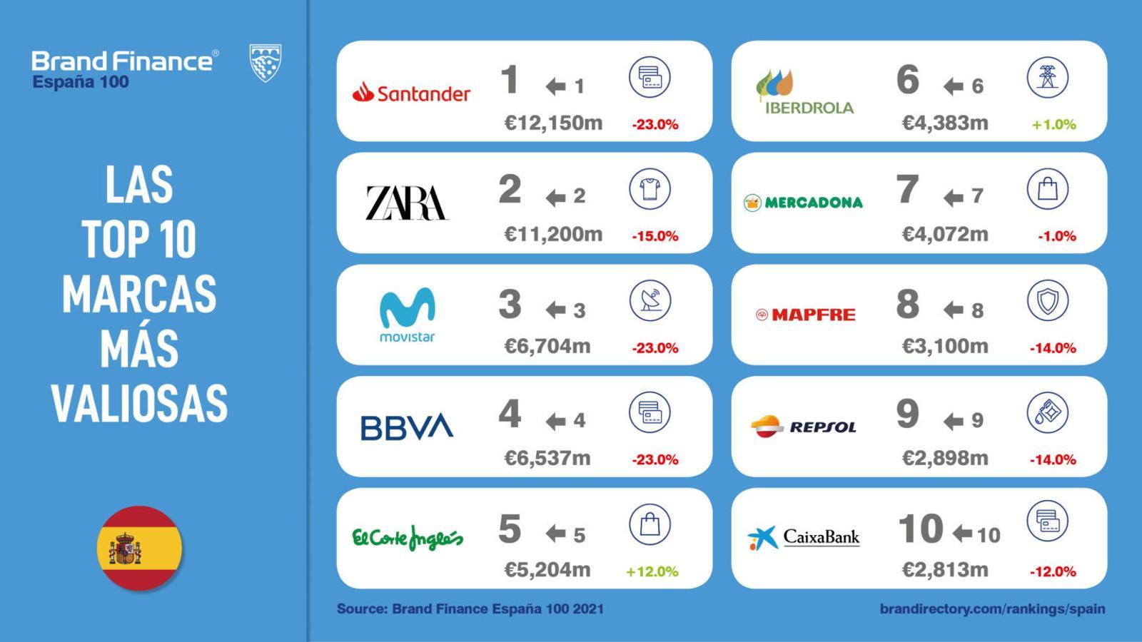Por su parte, la enseña valenciana se sitúa en séptima posición de esta clasificación como la marca del segmento más valiosa de España (4.072 millones de euros), el 10,2% menos que en 2020.