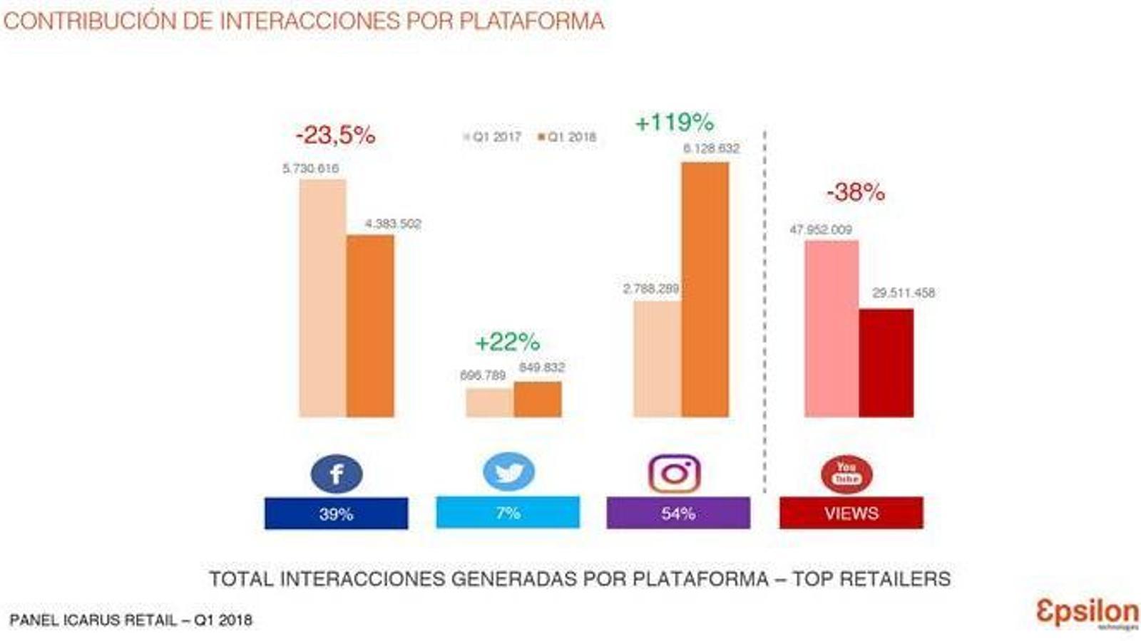 El informe señala que el mercado del retail "vuelve a demostrar su gran fortaleza en redes sociales generando más de 11 millones de interacciones (un 23,11% más), dato que, en línea con la tendencia de los últimos trimestres, significa un incremento de más de 2 millones de nuevos fans al trimestre".