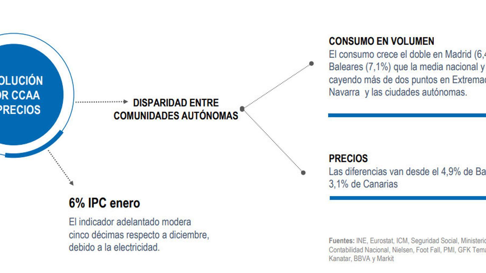 El consumo avanzó en volumen el 2,9% hasta diciembre, pero sigue el 3,1% por debajo de 2019. La alimentación pierde el 0,8% y el resto de productos avanzan el 5,9%.