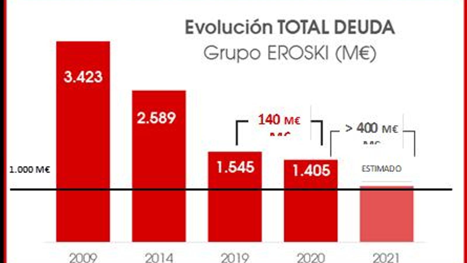 "En los últimos años Eroski ha ido cumpliendo los compromisos de reducción de deuda contraídos, incluso en el tiempo de la Covid y, al mismo tiempo, ha ido reconvirtiendo los negocios hacia modelos más competitivos. Ahora se encuentra en condiciones de abordar el fin de una etapa de exceso de deuda y prevemos alcanzar niveles de normalidad en nuestra deuda financiera neta al final de 2021", ha recordado Markaide.