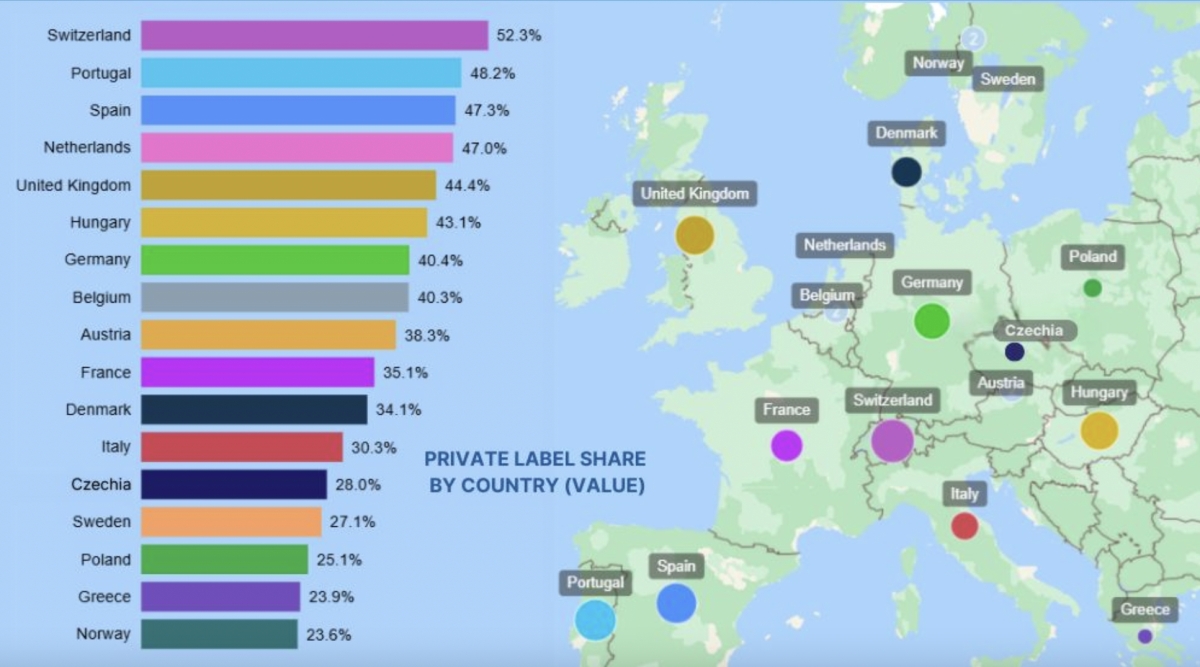 El mayor salto se produjo en España, con un crecimiento de 1,1 puntos porcentuales, hasta el 47,3% de cuota en valor. El dato sitúa al mercado español como el de mayor avance interanual en Europa y lo consolida como uno de los más maduros en penetración de enseñas propias, impulsado por la posición dominante de Mercadona y el ascenso de Lidl. Solo Suiza, con un 52,3% —único país por encima del 50%— y Portugal, superan a España en cuota total.