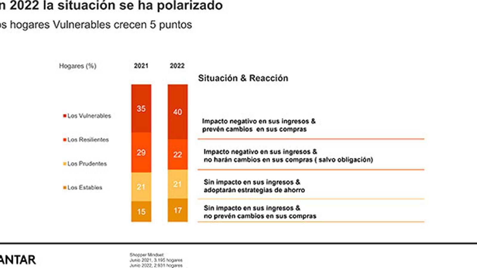 Si comparamos con el año anterior, podemos observar que se ha polarizado más la población, ya que al 78% de los encuestados les preocupa la situación económica del país. "La gran diferencia con otros periodos de crisis lo ha marcado el fin de la pandemia. No obstante, en la crisis actual se ha incrementado el número de hogares vulnerables, hasta llegar al 40%, que es más probable que cambien sus hábitos de compra", ha subrayado Mayte González, experta en shopper en Kantar Worldpanel.