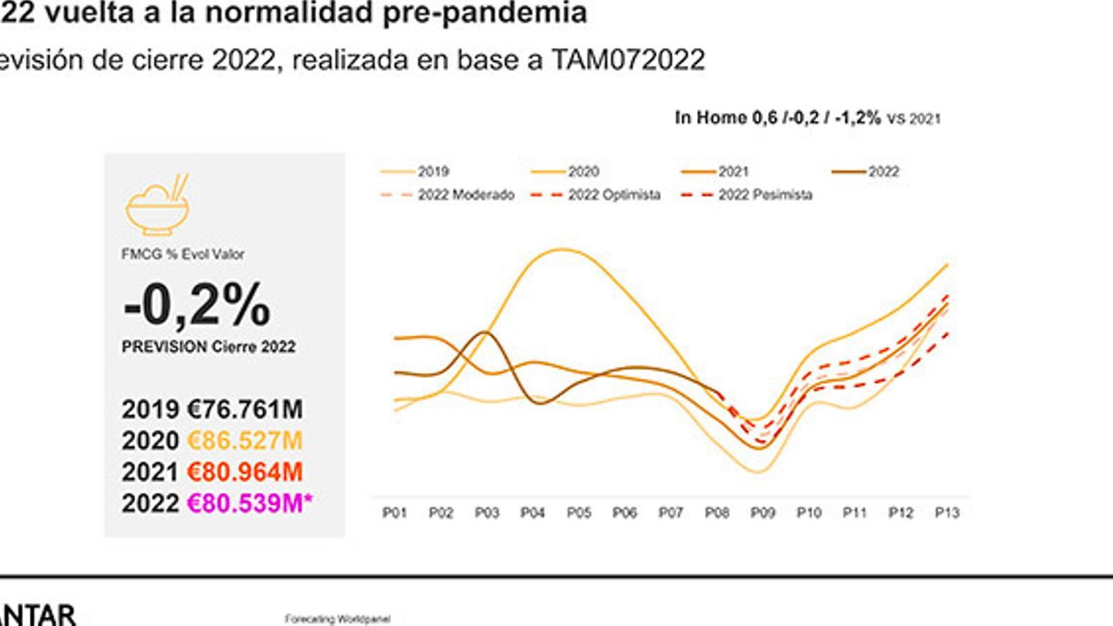 Kantar sostiene que, a pesar del incremento de los precios y la incertidumbre, 2022 se caracterizará por ser el de la "vuelta a la normalidad prepandemia" en el gran consumo. En un inicio, la consultora prevé que el consumo de los hogares para el cierre del año alcance los 80,54 mil millones de euros, una cifra el -0,2% por debajo a la de 2021.