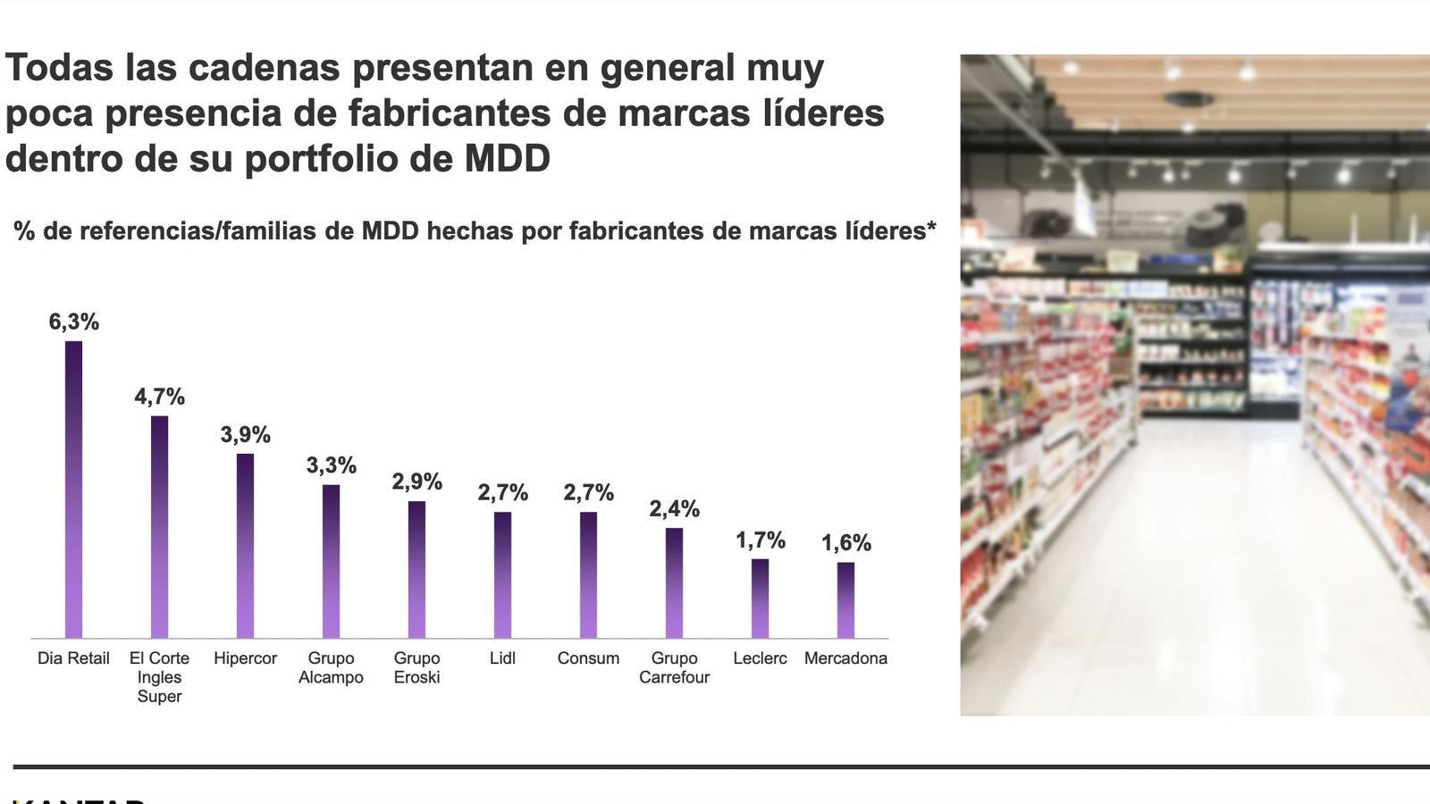 En general, los fabricantes de marcas líderes tienen poca presencia dentro del portfolio MDD de los distribuidores. En Dia, que ocupa el primer lugar, sólo el 6,3% de sus referencias MDD está fabricada por marcas líderes; en El Corte Inglés Supermercados esta cuota cae al 4,7%; en Hipercor es del 3,9%; en Alcampo, del 3,3%; en Eroski, del 2,9%, en Lidl y Consum, del 2,7%; en Carrefour, de 2,4%; y en Mercadona, representan un exiguo 1,6%.