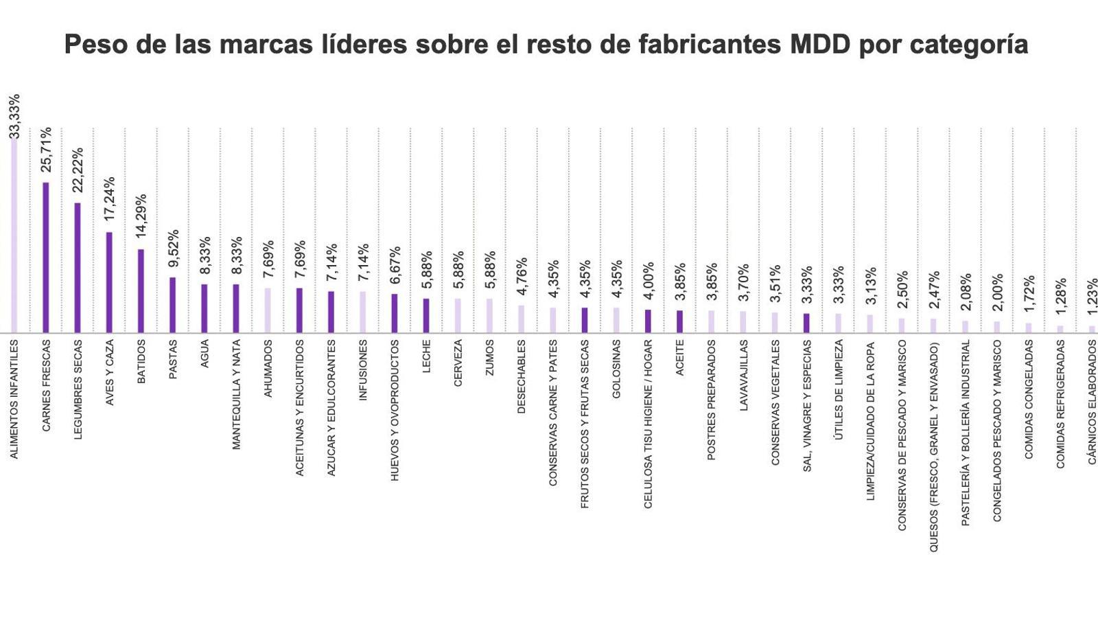 En la otra mitad de categorías, el porcentaje de fabricantes de marcas líderes es, en promedio, del 10%. Su peso es particularmente relevante en categorías como alimentos infantiles (33,3%), carnes frescas (25,7%), legumbres secas (22,2%), batidos (14,3%), pastas (9,52%), agua (8,3%) y mantequilla y nata (8,3%).