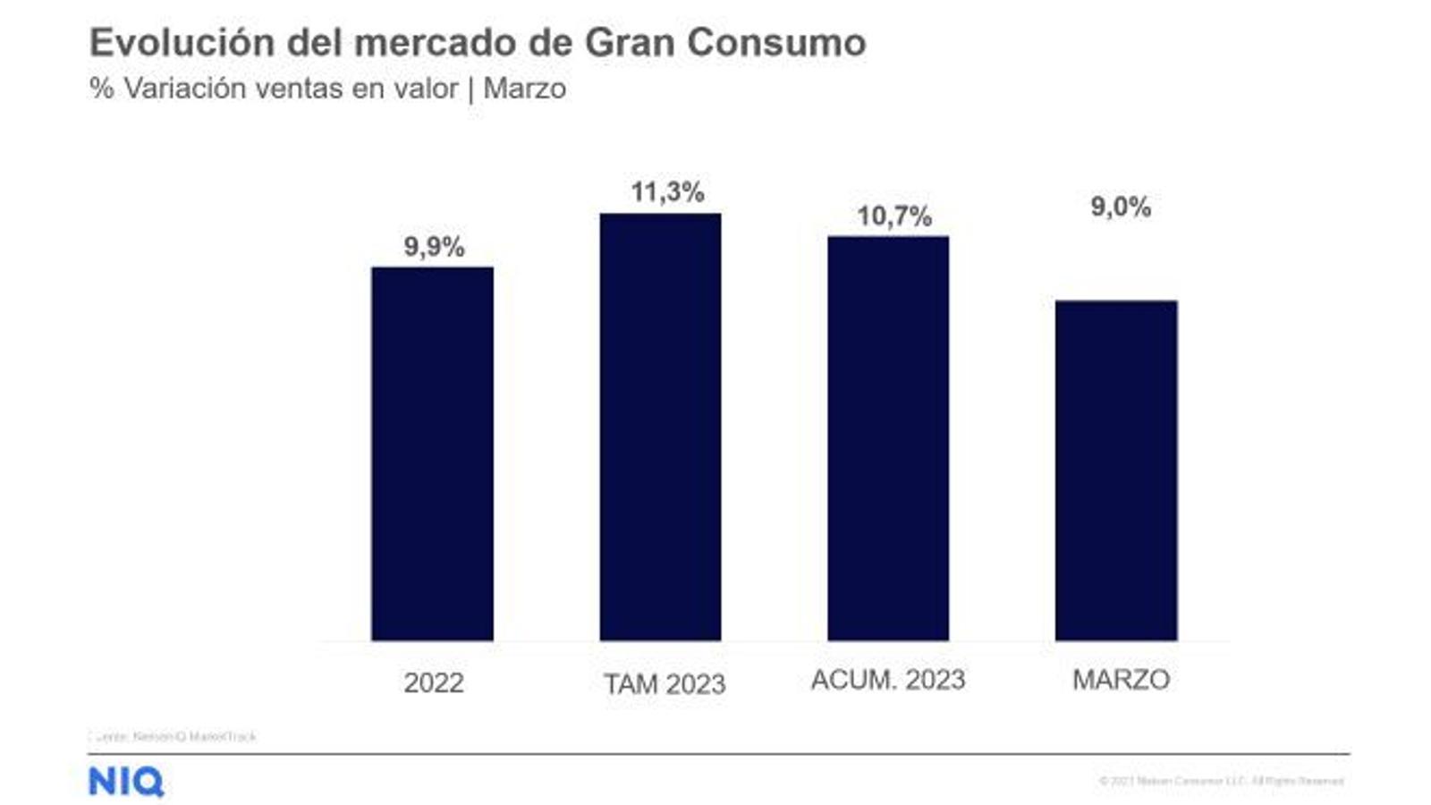 En España las ventas totales de bienes de consumo se incrementaron un 9% interanual en marzo, un dato que se sitúa por debajo de los dos dígitos por primera vez en este trimestre de 2023 (10,7% de acumulado). Se observa un crecimiento del 15,2% en el precio promedio, pero al mismo tiempo un retroceso en la demanda en volumen del 5,3%, según los últimos datos publicados por NIQ.