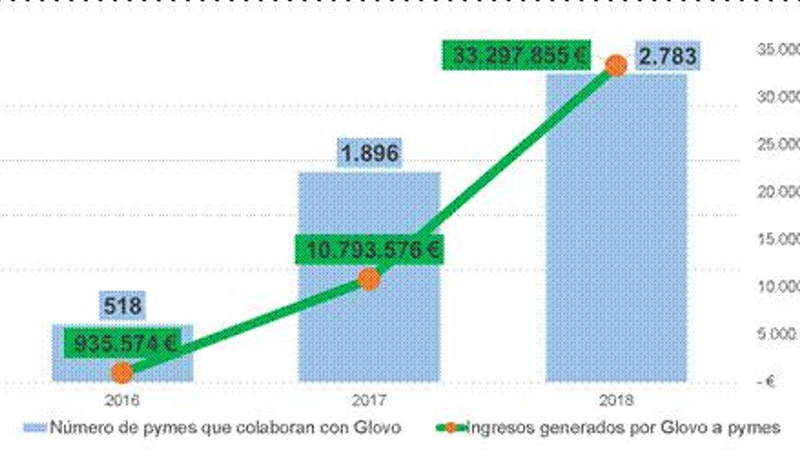 Glovo generó en 2018 más de 33 millones de euros de ingresos a las pequeñas y medianas empresas españolas asociadas. En concreto, la facturación a través de la startup española de todas estas pymes ascendió a 33.297.855 euros, una cifra que triplica los datos de 2017 (10,8 millones) y multiplica por 35 los de 2016, cuando se registró algo menos de un millón de euros, informa la compañía.