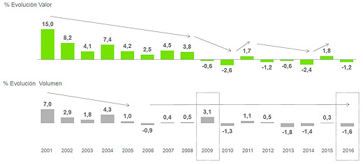 Según los datos de Kantar Worldpanel, en su balance de 2016, el Gran Consumo bajó el 1,6% en volumen y el 1,2% en valor durante el año pasado. El mayor consumo extradoméstico ha hecho que se realizasen 5,7 millones menos de ingestas dentro del hogar, especialmente en las comidas más copiosas del día como son el almuerzo y la cena. "Cuando estalló la crisis, hubo un crecimiento importante de la demanda porque la primera medida de ahorro de los hogares fue quedarse en casa. Ahora que la economía se recupera, el sector del gran consumo debe devolver ese volumen prestado y ahora se encuentra ajustándose a esta nueva situación, ya que a los españoles nos gusta salir", analiza César Valencoso, Consumer Insights Consulting Director en Kantar.