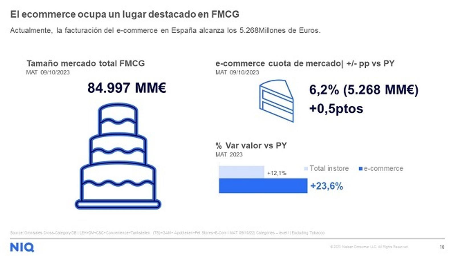 La facturación del ecommerce de bienes de gran consumo —excluyendo frescos— en España alcanzó los 5.268 millones de euros anuales hasta septiembre de 2023, lo que representa una cuota del 6,2% sobre el total del gasto en la cesta de la compra, creciendo el 0,5% en el último año. Además, su evolución de las ventas en valor ha doblado el mercado offline, al incrementarse el 23,6% frente al 12,1% registrado en establecimientos físicos, según un estudio de NIQ.