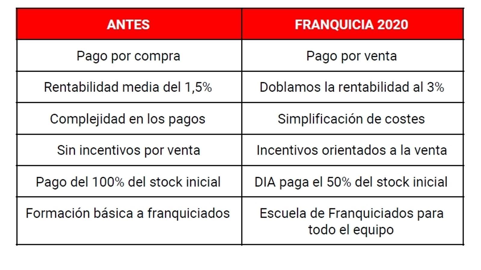 1.- Nuevo método de pago de la mercancía por parte del franquiciado que garantice el correcto abastecimiento de la tienda. Hasta el momento, el Grupo entregaba el pedido a sus franquiciados una vez que la mercancía había sido abonada. Con la Franquicia Dia 2020, el franquiciado pagará la mercancía cuando ya la haya vendido y no antes, favoreciendo así la tesorería de la tienda.