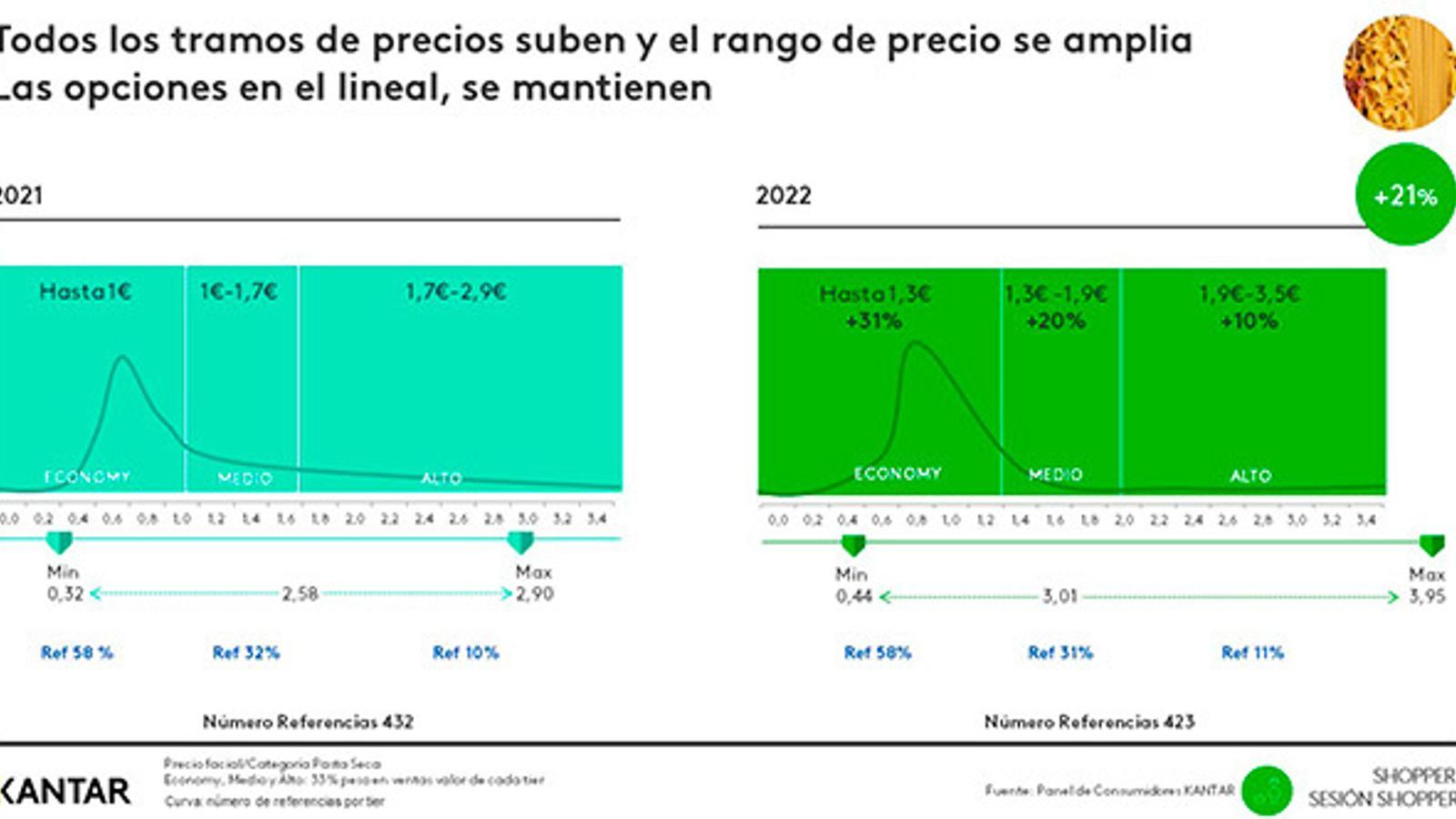 Los precios suben en todos los tramos y su rango se amplía, aunque las opciones de gama alta, media y económica en el lineal se mantienen. Esta situación implica que el consumidor se fije más en el precio y en los lineales que antes.