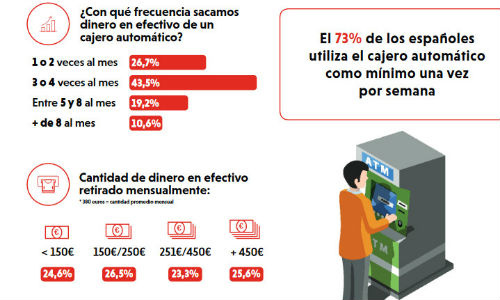 Asimismo, el 73% de los españoles afirma utilizar el cajero automático para disponer de efectivo como mínimo una vez por semana. Una de las principales razones que motivan el uso de efectivo en España es la garantía que ofrece ante imprevistos dado que es el método de pago aceptado en cualquier establecimiento. Sin embargo, una de las conclusiones más relevantes del estudio es que el 40% percibe que cada vez hay menor número de cajeros disponibles.