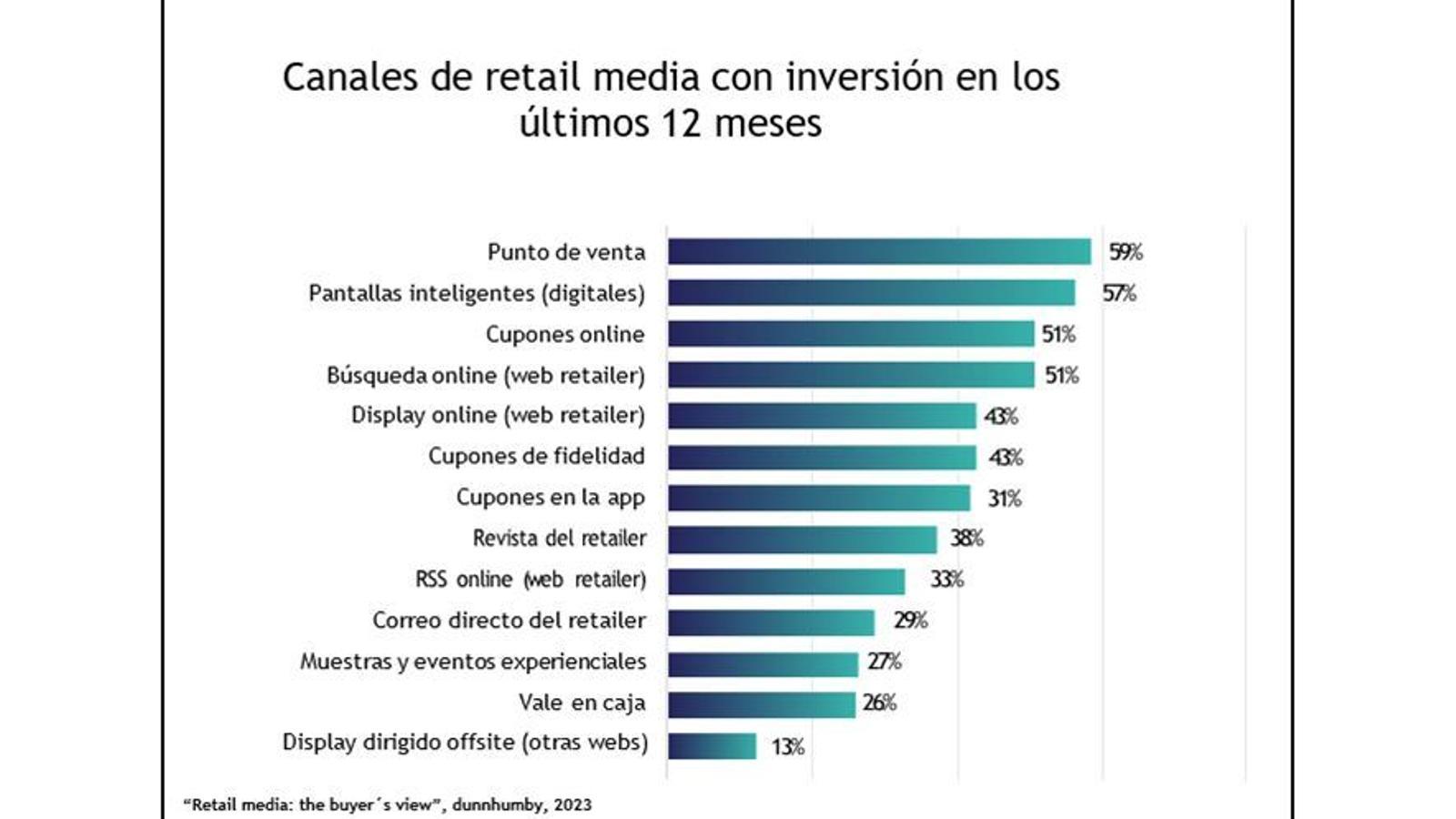 A pesar del auge del e-commerce, una de las principales conclusiones del informe es el gran peso que las tiendas físicas siguen teniendo para el Retail Media de alimentación. Así, el año pasado marcas y agencias concentraron claramente sus inversiones en el punto de venta (59%) y las pantallas digitales en tienda (57%).