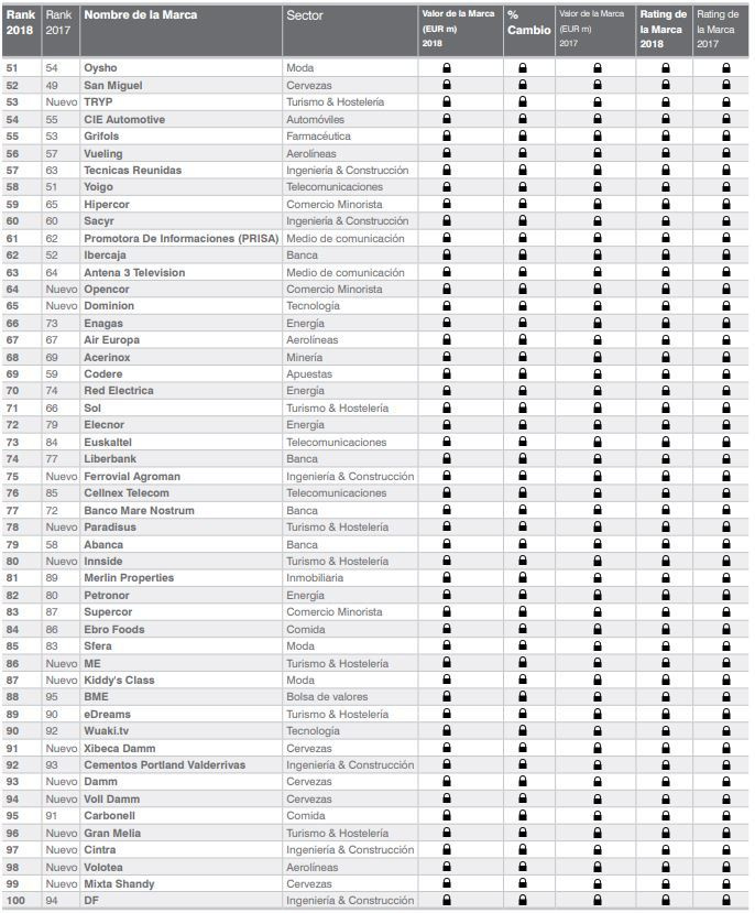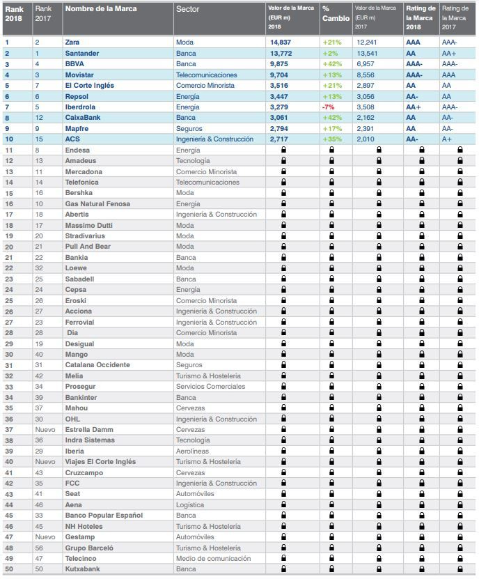 Zara es líder con un valor de marca de 14.837 millones de euros y un aumento de más del 21% respecto al año pasado. El Top 10 lo completan Santander (13.772 millones de euros; +2%); BBVA (9.875 millones de euros, +42%); Movistar (9.704 millones de euros, +13%); la citada El Corte Inglés; Repsol (3.447 millones de euros, +13%); Iberdrola (3.279 millones de euros, -7%); Caixabank (3.061 millones de euros, +42%); Mapfre (2.794 millones de euros, +17%) y ACS (2.717 millones de euros, +35%).