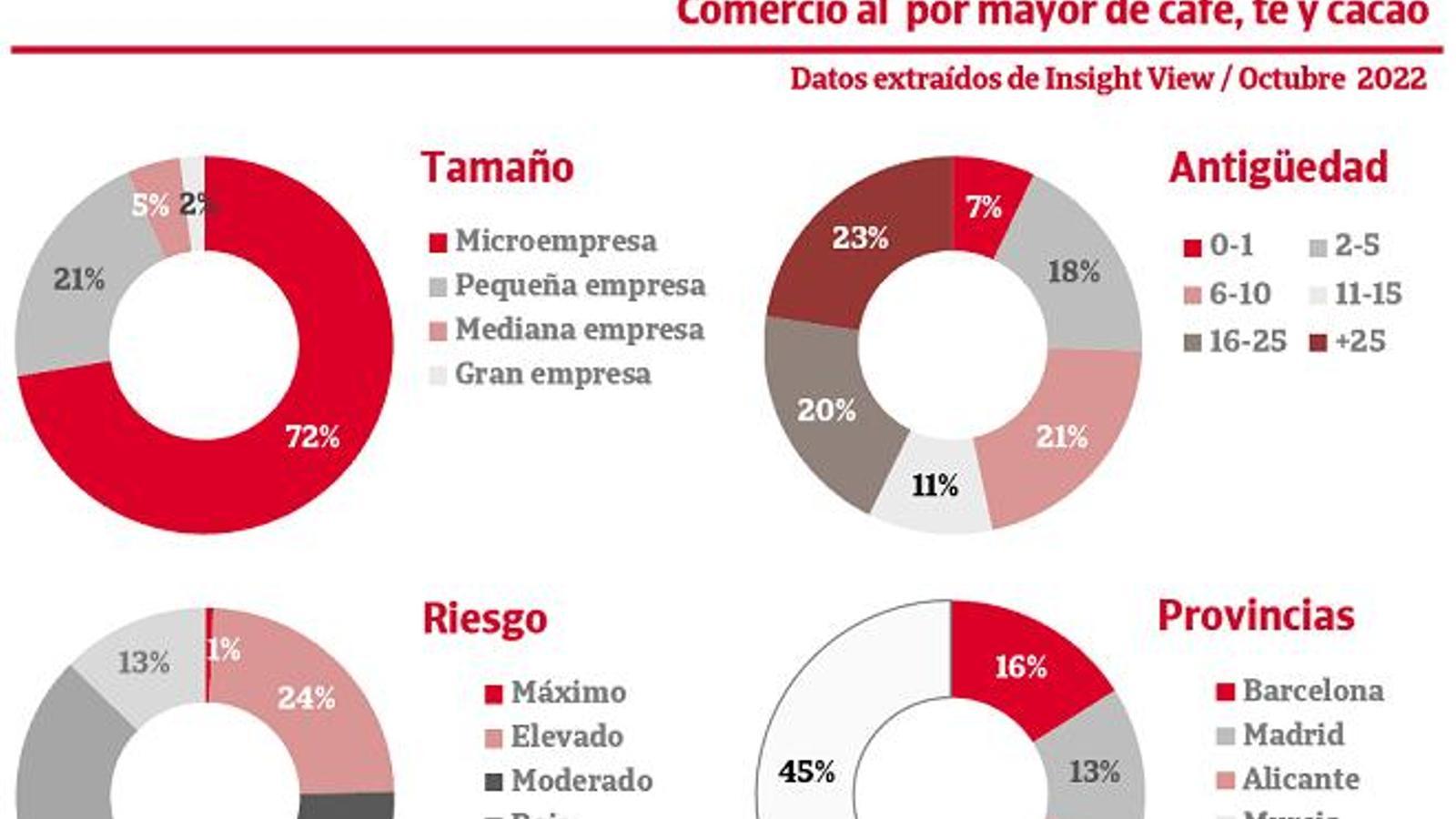 El citado análisis detalla que los mayoristas de café, té y cacao se concentran en las provincias de Barcelona (16%), Madrid (13%), Alicante (8%), Murcia (7%), Valencia (6%) y Málaga (5%). De las seis primeras provincias del sector, Valencia presenta el mayor deterioro del riesgo de crédito: el 32% de los mayoristas se encuentra en un nivel máximo o elevado de impago. Le siguen Alicante (29%), Barcelona (24%), Madrid (23%), Málaga (23%) y Murcia (23%).
