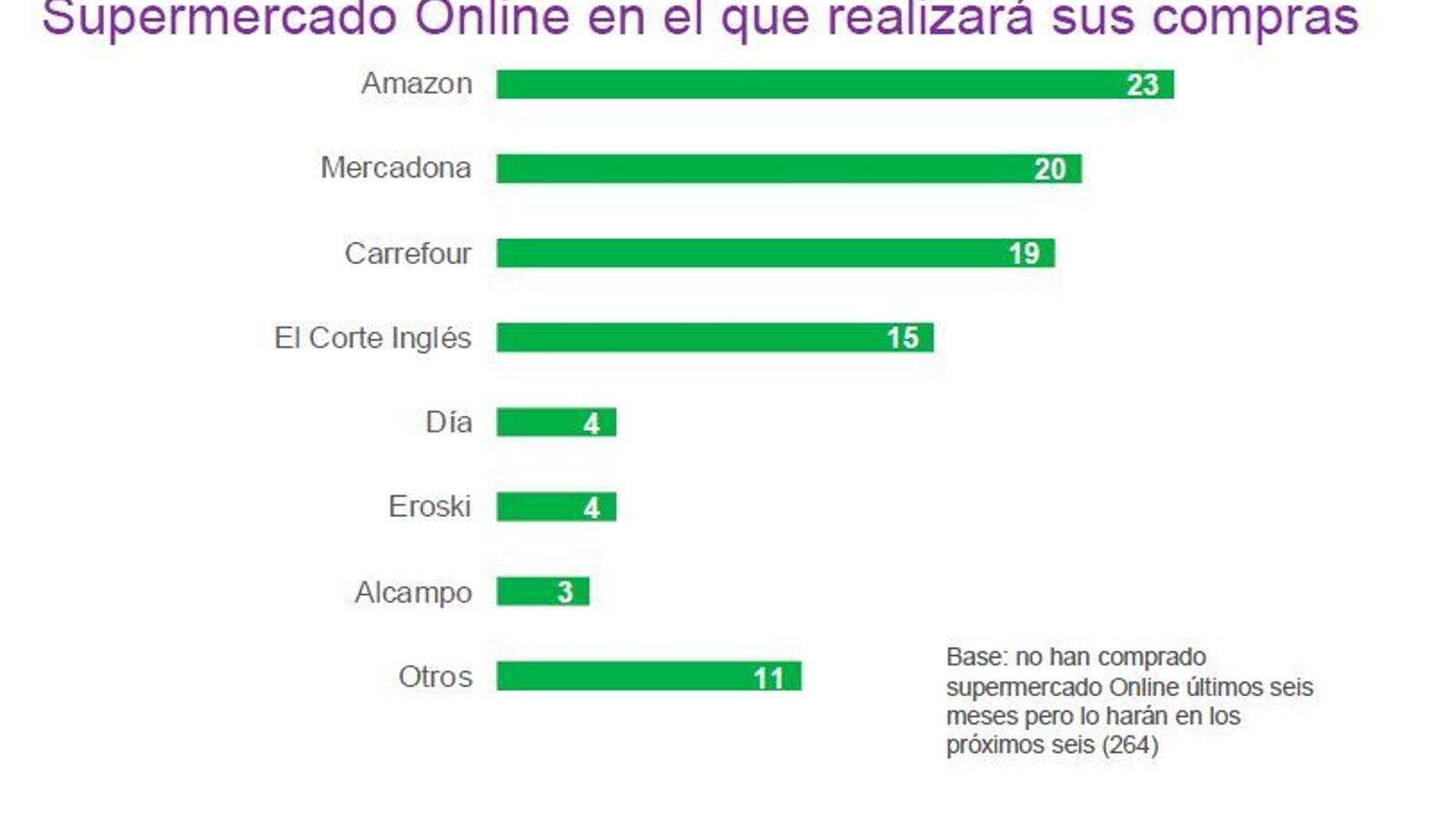 Y aquí sorprende la fuerza de Amazon, pues de los nuevos compradores, el 23% señala que acudirá al gigante estadounidense para comprar alimentos y bebidas, mientras que el 20% se decanta por Mercadona y el 19% por Carrefour. El 15% apunta a El Corte Inglés y ya a mucha distancia aparecen en intención de compra Dia (4%), Eroski (4%) y Alcampo (3%).