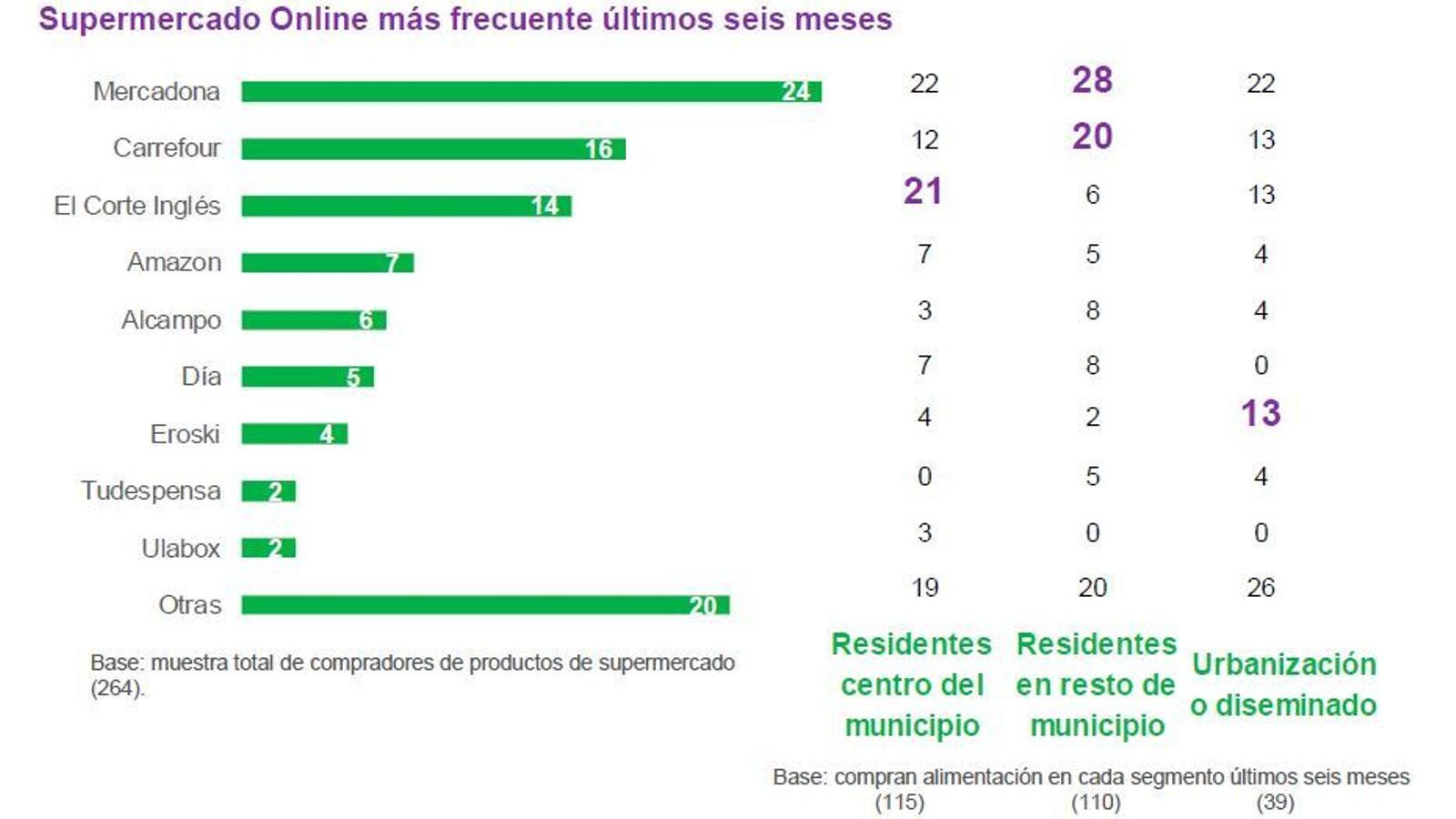 Otras cadenas aún tienen menos presencia a nivel online. Eroski (4%), Tudespensa (2%) y Ulabox (2%) también aparecen en el estudio. Un 20% de los encuestados señala otros supermercados online.