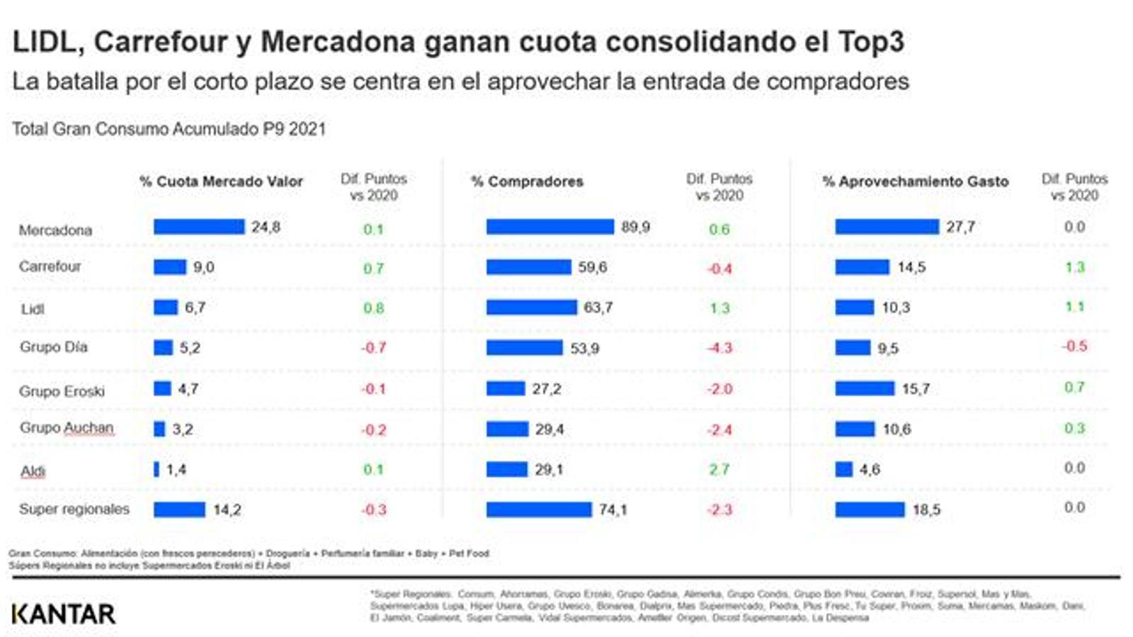 Con el regreso paulatino de la normalidad, el Top3 de la distribución española ha vuelto a ganar cuota de mercado. Mercadona, que sigue siendo líder, presenta atisbos de mejora, aunque no ha recuperado todavía por completo el punto de cuota que perdió durante la pandemia, situándose en la actualidad en el 24,8%, según el Ranking 2021 elaborado por Kantar Worldpanel.