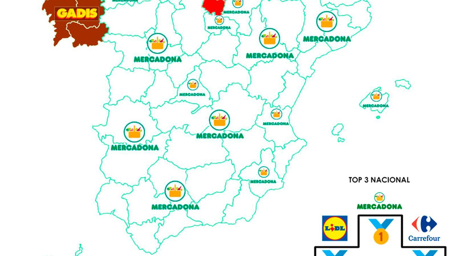 En concreto, este estudio indica que en supermercados el logo de Mercadona reina en casi todos los territorios de España. La enseña vasca Eroski y la gallega Gadis se mantienen firmes en sus lugares de origen pese a la expansión de la valenciana. La enseña que preside Juan Roig se ha hecho con una legión de apóstoles, a pesar de no ser líder en cobertura en la mayor parte de comunidades (como se puede ver en el siguiente mapa). Justo lo que refleja el Top 3 nacional con Mercadona (49,8% de los votos) superando a sus perseguidores, Lidl (16,3%) y Carrefour (15,4%), en tres veces.